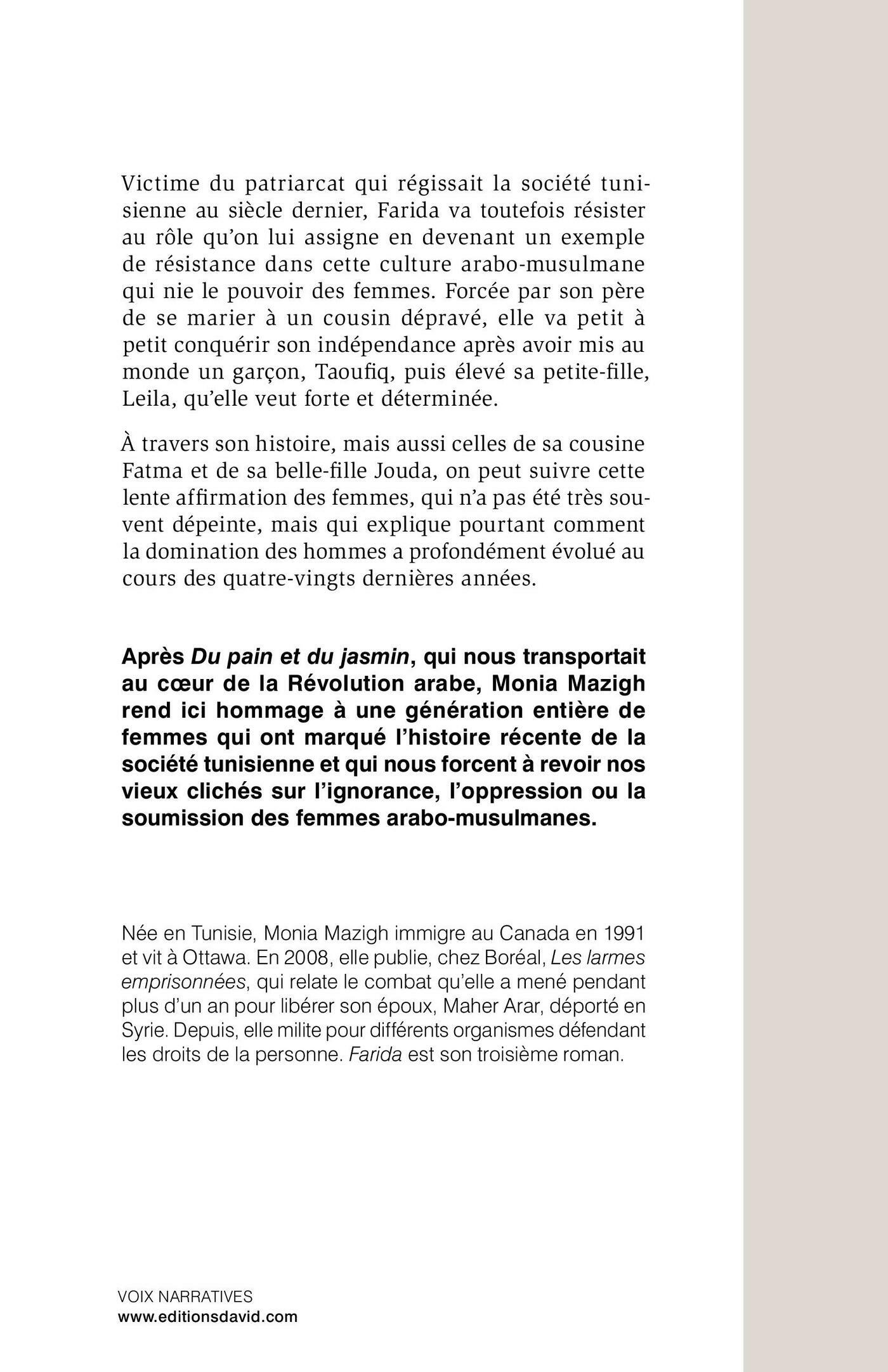 Victime du patriarcat qui régissait la société tunisienne au siècle dernier, Farida va toutefois résister au rôle qu’on lui assigne en devenant un exemple de résistance dans cette culture arabo-musulmane qui nie le pouvoir des femmes. Forcée par son père de se marier à un cousin dépravé, elle va petit à petit conquérir son indépendance après avoir mis au monde un garçon, Taoufiq, puis élevé sa petite-fille, Leila, qu’elle veut forte et déterminée.À travers son histoire, mais aussi celles de sa cousine Fatma et de sa belle-fille Jouda, on peut suivre cette lente affirmation des femmes, qui n’a pas été très souvent dépeinte, mais qui explique pourtant comment la domination des hommes a profondément évolué au cours des quatre-vingts dernières années.Après Du pain et du jasmin, qui nous transportait au cœur de la Révolution arabe, Monia Mazigh rend ici hommage à une génération entière de femmes qui ont marqué l’histoire récente de la société tunisienne et qui nous forcent à revoir nos vieux clichés sur l’ignorance, l’oppression ou la soumission des femmes arabo-musulmanes.