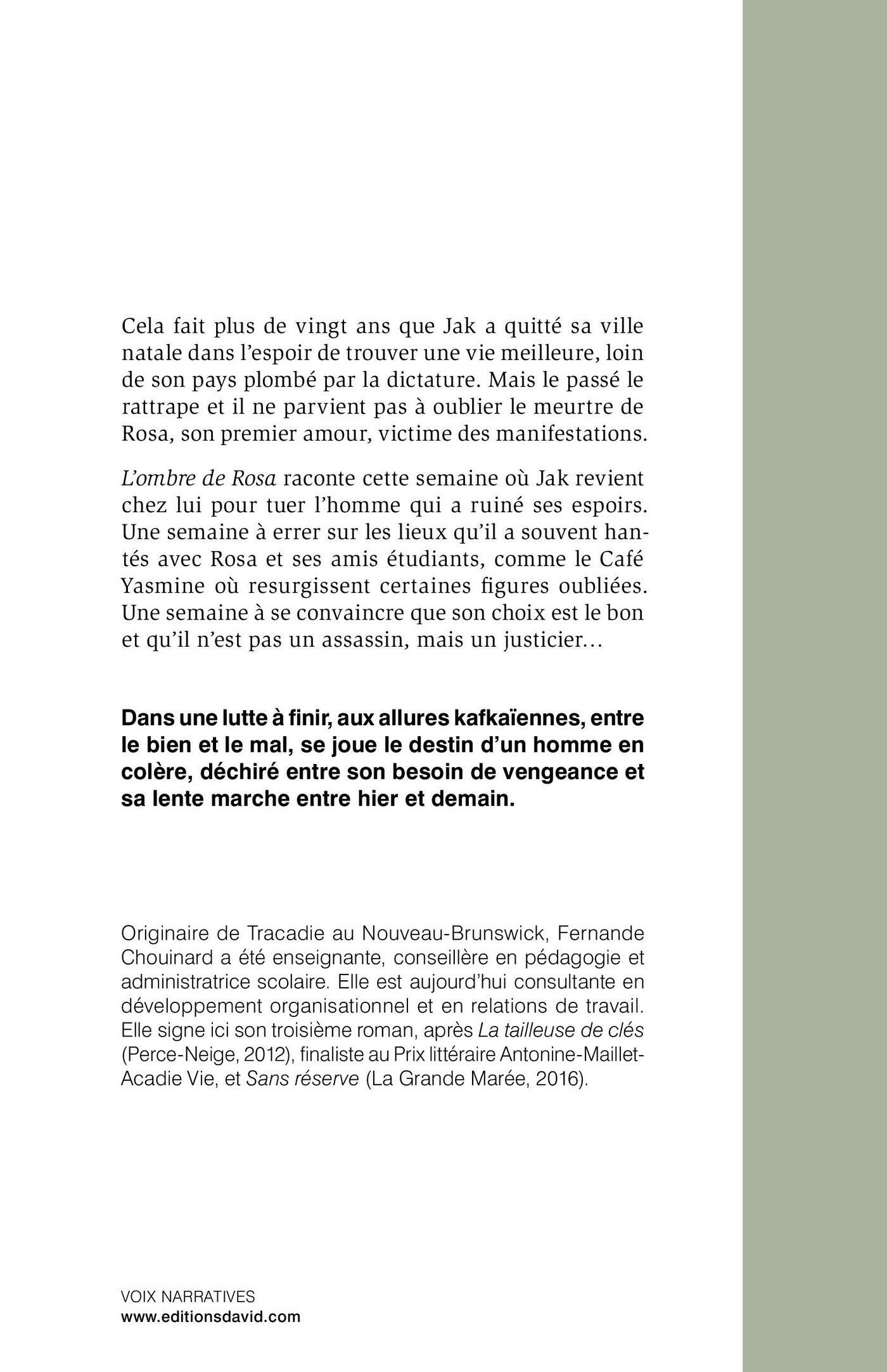 Cela fait plus de vingt ans que Jak a quitté sa ville natale dans l’espoir de trouver une vie meilleure, loin de son pays plombé par la dictature. Mais le passé le rattrape et il ne parvient pas à oublier le meurtre de Rosa, son premier amour, victime des manifestations.L’ombre de Rosa raconte cette semaine où Jak revient chez lui pour tuer l’homme qui a ruiné ses espoirs. Une semaine à errer sur les lieux qu’il a souvent hantés avec Rosa et ses amis étudiants, comme le Café Yasmine où resurgissent certaines figures oubliées. Une semaine à se convaincre que son choix est le bon et qu’il n’est pas un assassin, mais un justicier…Dans une lutte à finir, aux allures kafkaïennes, entre le bien et le mal, se joue le destin d’un homme en colère, déchiré entre son besoin de vengeance et sa lente marche entre hier et demain.