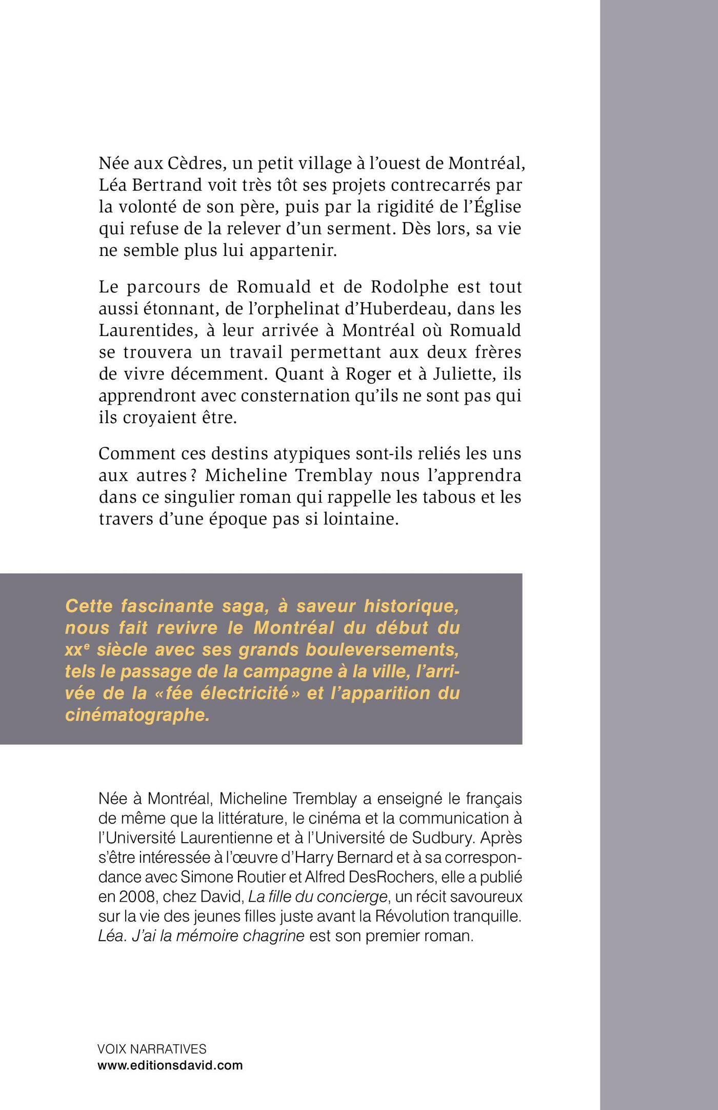 Née aux Cèdres, un petit village à l’ouest de Montréal, Léa Bertrand voit très tôt ses projets contrecarrés par la volonté de son père, puis par la rigidité de l’Église qui refuse de la relever d’un serment. Dès lors, sa vie ne semble plus lui appartenir. Le parcours de Romuald et de Rodolphe est tout aussi étonnant, de l’orphelinat d’Huberdeau, dans les Laurentides, à leur arrivée à Montréal où Romuald se trouvera un travail permettant aux deux frères de vivre décemment. Quant à Roger et à Juliette, ils apprendront avec consternation qu’ils ne sont pas qui ils croyaient être. Comment ces destins atypiques sont-ils reliés les uns aux autres ? Micheline Tremblay nous l’apprendra dans ce singulier roman qui rappelle les tabous et les travers d’une époque pas si lointaine.Cette fascinante saga, à saveur historique, nous fait revivre le Montréal du début du XXe siècle avec ses grands bouleversements, tels le passage de la campagne à la ville, l’arrivée de la « fée électricité » et l’apparition du cinématographe.