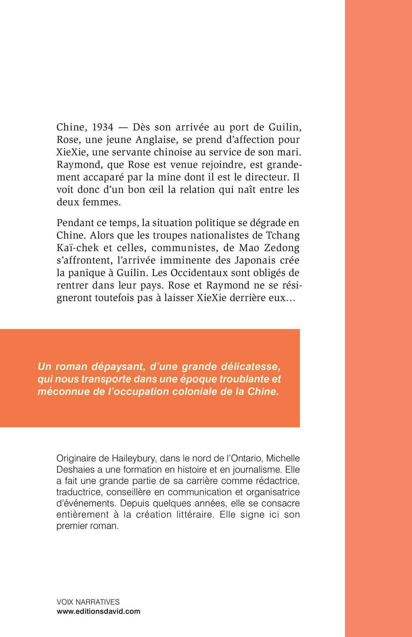 Chine, 1934 — Dès son arrivée au port de Guilin, Rose, une jeune Anglaise, se prend d’affection pour XieXie, une servante chinoise au service de son mari. Raymond, que Rose est venue rejoindre, est grandement accaparé par la mine dont il est le directeur. Il voit donc d’un bon œil la relation qui naît entre les deux femmes. Pendant ce temps, la situation politique se dégrade en Chine. Alors que les troupes nationalistes de Tchang Kaï-chek et celles, communistes, de Mao Dsedong s’affrontent, l’arrivée imminente des Japonais crée la panique à Guilin. Les Occidentaux sont obligés de rentrer dans leur pays. Rose et Raymond ne se résigneront toutefois pas à laisser XieXie derrière eux… Un roman dépaysant, d’une grande délicatesse, qui nous transporte dans une époque troublante et méconnue de l’occupation coloniale de la Chine.