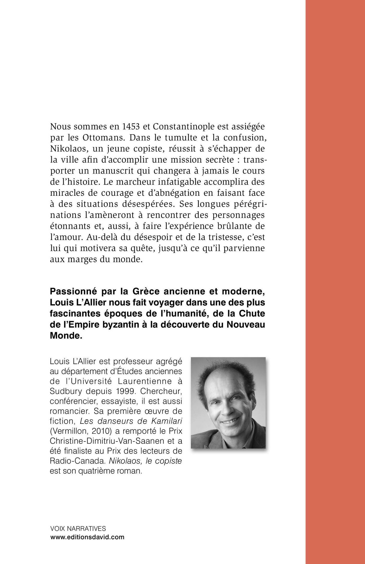 Nous sommes en 1453 et Constantinople est assiégée par les Ottomans. Dans le tumulte et la confusion, Nikolaos, un jeune copiste, réussit à s’échapper de la ville afin d’accomplir une mission secrète : transporter un manuscrit qui changera à jamais le cours de l’histoire. Le marcheur infatigable accomplira des miracles de courage et d’abnégation en faisant face à des situations désespérées. Ses longues pérégrinations l’amèneront à rencontrer des personnages étonnants et, aussi, à faire l’expérience brûlante de l’amour. Au-delà du désespoir et de la tristesse, c’est lui qui motivera sa quête, jusqu’à ce qu’il parvienne aux marges du monde.Passionné par la Grèce ancienne et moderne, Louis L’Allier nous fait voyager dans une des plus fascinantes époques de l’humanité, de la Chute de l’Empire byzantin à la découverte du Nouveau Monde.
