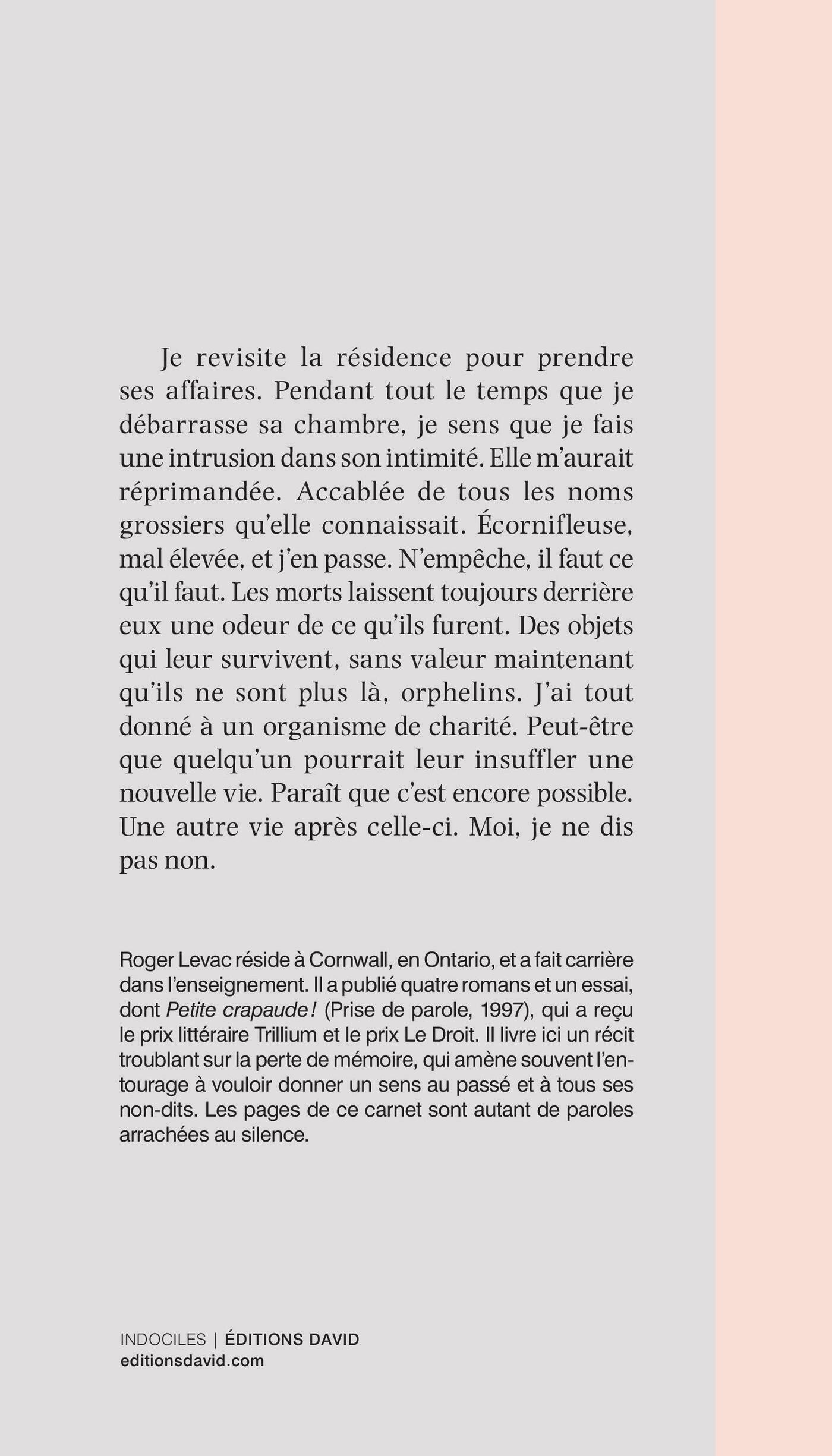 Je revisite la résidence pour prendre ses affaires. Pendant tout le temps que je débarrasse sa chambre, je sens que je fais une intrusion dans son intimité. Elle m’aurait réprimandée. Accablée de tous les noms grossiers qu’elle connaissait. Écornifleuse, mal élevée, et j’en passe. N’empêche, il faut ce qu’il faut. Les morts laissent toujours derrière eux une odeur de ce qu’ils furent. Des objets qui leur survivent, sans valeur maintenant qu’ils ne sont plus là, orphelins. J’ai tout donné à un organisme de charité. Peut-être que quelqu’un pourrait leur insuffler une nouvelle vie. Paraît que c’est encore possible. Une autre vie après celle-ci. Moi, je ne dis pas non.Roger Levac réside à Cornwall, en Ontario, et a fait carrière dans l’enseignement. Il a publié quatre romans et un essai, dont Petite crapaude ! (Prise de parole, 1997), qui a reçu le prix littéraire Trillium et le prix Le Droit. Il livre ici un récit troublant sur la perte de mémoire, qui amène souvent l’entourage à vouloir donner un sens au passé et à tous ses non-dits. Les pages de ce carnet sont autant de paroles arrachées au silence.