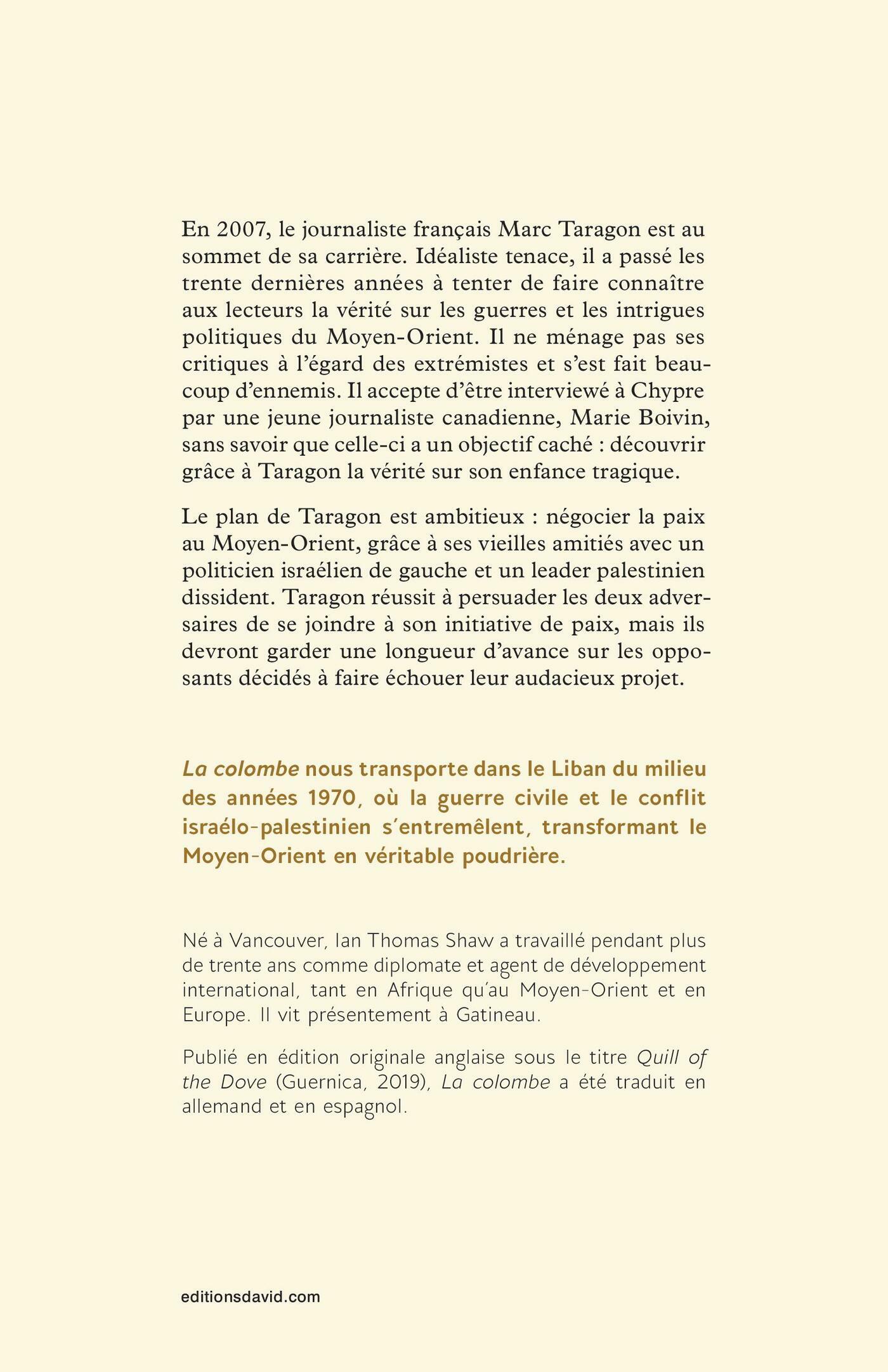 En 2007, le journaliste français Marc Taragon est au sommet de sa carrière. Idéaliste tenace, il a passé les trente dernières années à tenter de faire connaître aux lecteurs la vérité sur les guerres et les intrigues politiques du Moyen-Orient. Il ne ménage pas ses critiques à l’égard des extrémistes et s’est fait beaucoup d’ennemis. Il accepte d’être interviewé à Chypre par une jeune journaliste canadienne, Marie Boivin, sans savoir que celle-ci a un objectif caché : découvrir grâce à Taragon la vérité sur son enfance tragique.Le plan de Taragon est ambitieux : négocier la paix au Moyen-Orient, grâce à ses vieilles amitiés avec un politicien israélien de gauche et un leader palestinien dissident. Taragon réussit à persuader les deux adversaires de se joindre à son initiative de paix, mais ils devront garder une longueur d’avance sur les opposants décidés à faire échouer leur audacieux projet.La colombe nous transporte dans le Liban du milieu des années 1970, où la guerre civile et le conflit israélo-palestinien s’entremêlent, transformant le Moyen-Orient en véritable poudrière.Né à Vancouver, Ian Thomas Shaw a travaillé pendant plus de trente ans comme diplomate et agent de développement international, tant en Afrique qu’au Moyen-Orient et en Europe. Il vit présentement à Gatineau.Publié en édition originale anglaise sous le titre Quill of the Dove (Guernica, 2019), La colombe a été traduit en allemand et en espagnol.
