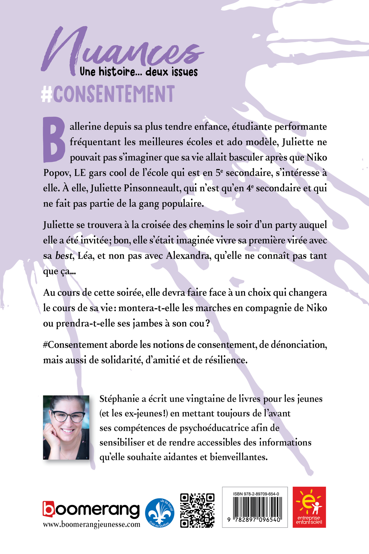 Ballerine depuis sa plus tendre enfance, étudiante performante fréquentant les meilleures écoles et ado modèle, Juliette ne pouvait pas s’imaginer que sa vie allait basculer après que Niko Popov, le gars cool de l’école qui est en 5° secondaire, s’intéresse à elle. À elle, Juliette Pinsonneault, qui n’est qu’en 4e secondaire et qui ne fait pas partie de la gang populaire. Juliette se trouvera à la croisée des chemins le soir d’un party auquel elle a été invitée; bon, elle s’était imaginée vivre sa première virée avec sa best, Léa, et non pas avec Alexandra, qu’elle ne connaît pas tant que ça. Au cours de cette soirée, elle devra faire face à un choix qui changera le cours de sa vie: montera-t-elle les marches en compagnie de Niko ou prendra-t-elle ses jambes à son cou ?#Consentement aborde les notions de consentement, de dénonciation, mais aussi de solidarité, d’amitié et de résilience.
