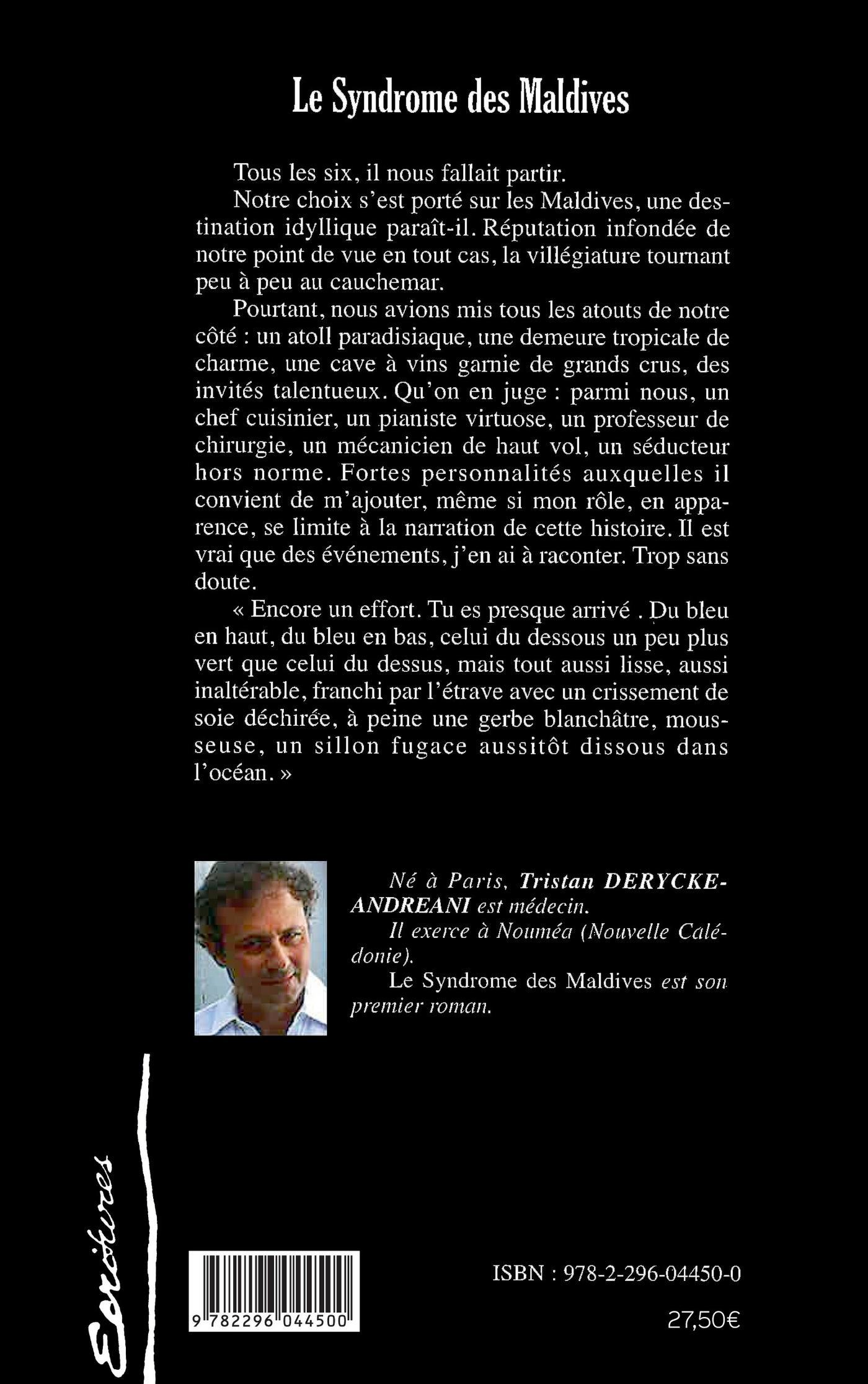 Tous les six, il nous fallait partir. Notre choix s'est porté sur les Maldives, une destination idyllique paraît-il. Réputation infondée de notre point de vue, la villégiature tournant peu à peu au cauchemar. Pourtant, nous avions mis toutes les chances de notre côté : un atoll paradisiaque, une demeure tropicale de charme, des invités talentueux ; un chef cuisinier, un pianiste virtuose, un professeur de chirurgie, un mécanicien de haut vol, un séducteur hors norme et moi, même si mon rôle se limite à la narration de cette histoire. Il est vrai que des événements, j'en ai à raconter. Trop sans doute.