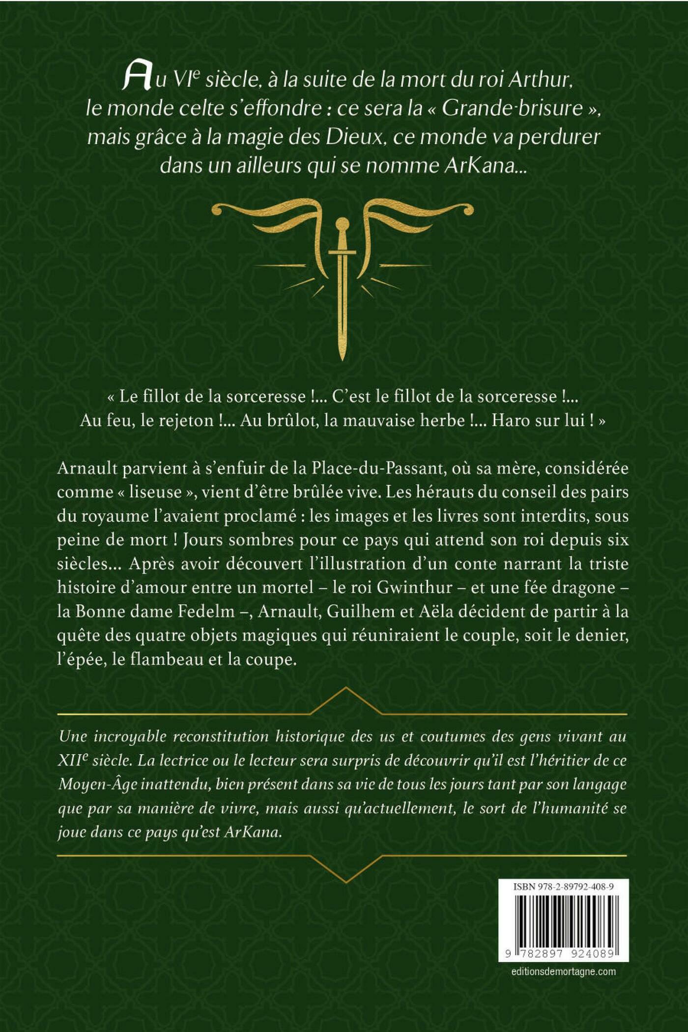 Au VIe siècle, à la suite de la mort du roi Arthur, le monde celte s’effondre : ce sera la « Grande-brisure », mais grâce à la magie des Dieux, ce monde va perdurer dans un ailleurs qui se nomme ArKana...« Le fillot de la sorceresse !... C’est le fillot de la sorceresse !... Au feu, le rejeton !... Au brûlot, la mauvaise herbe !... Haro sur lui ! »Arnault parvient à s’enfuir de la Place-du-Passant, où sa mère, considérée comme « liseuse », vient d’être brûlée vive. Les hérauts du conseil des pairs du royaume l’avaient proclamé : les images et les livres sont interdits, sous peine de mort ! Jours sombres pour ce pays qui attend son roi depuis six siècles… Après avoir découvert l’illustration d’un conte narrant la triste histoire d’amour entre un mortel – le roi Gwinthur – et une fée dragone – la Bonne dame Fedelm –, Arnault, Guilhem et Aëla décident de partir à la quête des quatre objets magiques qui réuniraient le couple, soit le denier, l’épée, le flambeau et la coupe.Une incroyable reconstitution historique des us et coutumes des gens vivants au XIIe siècle. La lectrice ou le lecteur sera surpris de découvrir qu’il est l’héritier de ce Moyen-Âge inattendu, bien présent dans sa vie de tous les jours tant par son langage que par sa manière de vivre, mais aussi qu’actuellement, le sort de l’humanité se joue dans ce pays qu’est ArKana.