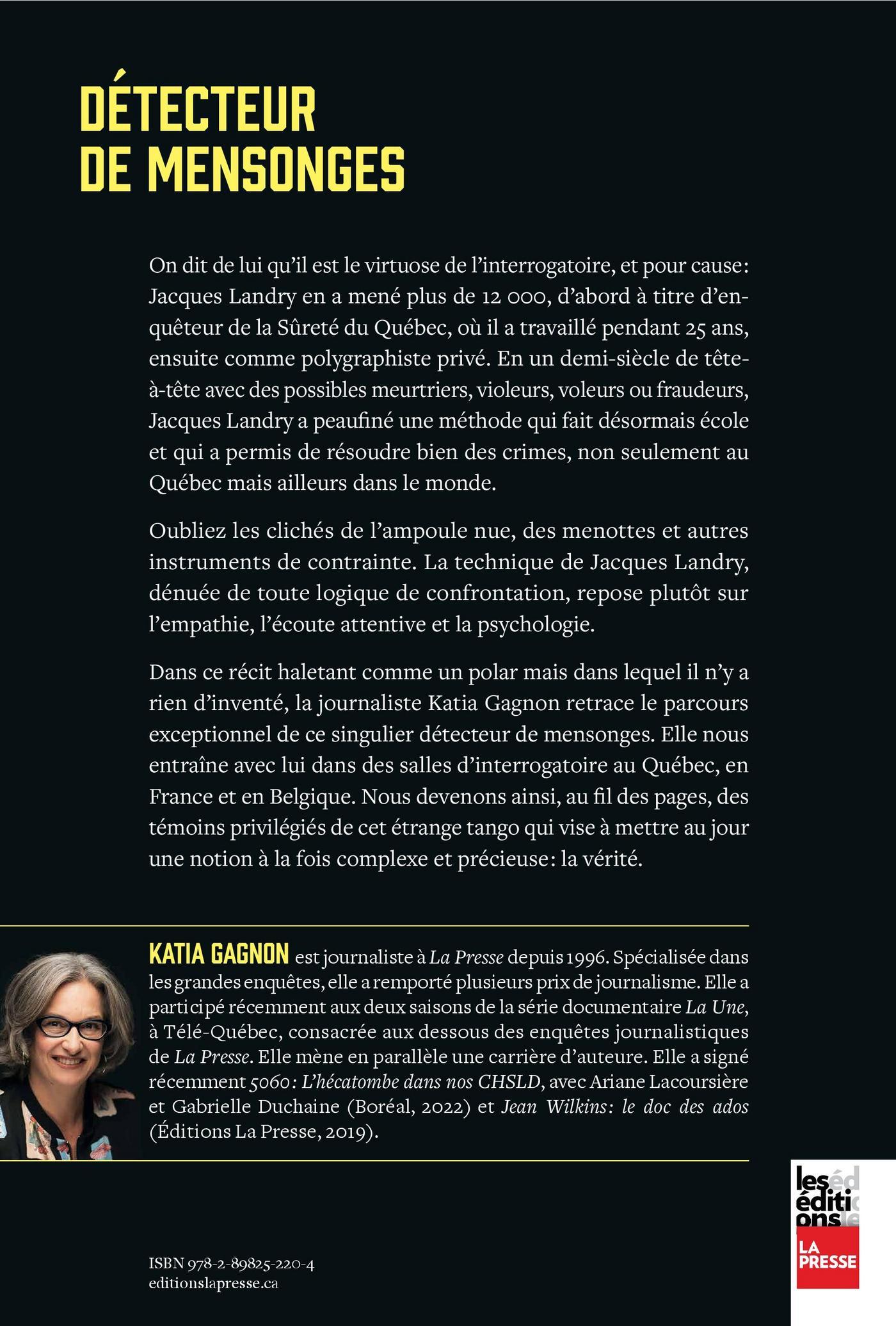 On dit de lui qu’il est le virtuose de l’interrogatoire, et pour cause : Jacques Landry en a mené plus de 12 000, d’abord à titre d’en - quêteur de la Sûreté du Québec, où il a travaillé pendant 25 ans, ensuite comme polygraphiste privé. En un demi-siècle de tête-à tête avec des possibles meurtriers, violeurs, voleurs ou fraudeurs, Jacques Landry a peaufiné une méthode qui fait désormais école et qui a permis de résoudre bien des crimes, non seulement au Québec mais ailleurs dans le monde.Oubliez les clichés de l’ampoule nue, des menottes et autres instruments de contrainte. La technique de Jacques Landry, dénuée de toute logique de confrontation, repose plutôt sur l’empathie, l’écoute attentive et la psychologie.Dans ce récit haletant comme un polar mais dans lequel il n’y a rien d’inventé, la journaliste Katia Gagnon retrace le parcours exceptionnel de ce singulier détecteur de mensonges. Elle nous entraîne avec lui dans des salles d’interrogatoire au Québec, en France et en Belgique. Nous devenons ainsi, au fil des pages, des témoins privilégiés de cet étrange tango qui vise à mettre au jour une notion à la fois complexe et précieuse : la vérité