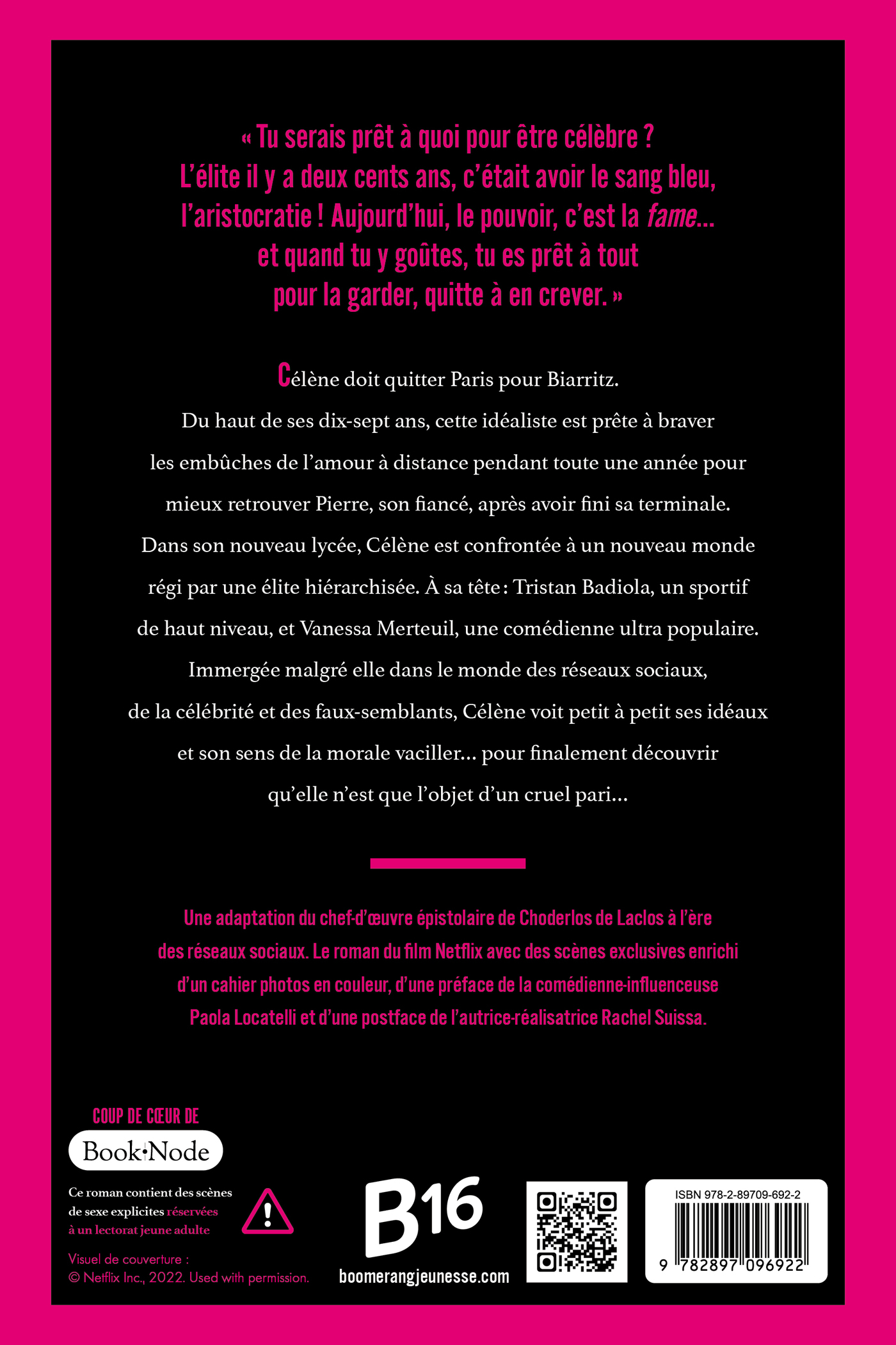 « Tu serais prêt à quoi pour être célèbre ? L’élite il y a deux cents ans, c’était avoir le sang bleu, l’aristocratie ! Aujourd’hui, le pouvoir, c’est la fame... et quand tu y goûtes, tu es prêt à tout pour la garder, quitte à en crever. » Célène doit quitter Paris pour Biarritz. Du haut de ses dix-sept ans, cette idéaliste est prête à braver les embûches de l’amour à distance pendant toute une année pour mieux retrouver Pierre, son fiancé, après avoir fini sa terminale. Dans son nouveau lycée, Célène est confrontée à un nouveau monde régi par une élite hiérarchisée. À sa tête : Tristan Badiola, un sportif de haut niveau, et Vanessa Merteuil, une comédienne ultra populaire. Immergée malgré elle dans le monde des réseaux sociaux, de la célébrité et des faux-semblants, Célène voit petit à petit ses idéaux et son sens de la morale vaciller... pour finalement découvrir qu’elle n’est que l’objet d’un cruel pari... Une adaptation du chef-d’oeuvre épistolaire de Choderlos de Laclos à l’ère des réseaux sociaux. Le roman du film Netflix avec des scènes exclusives enrichi d’un cahier photos en couleur, d’une préface de la comédienne-influenceuse Paola Locatelli et d’une postface de l’autrice-réalisatrice Rachel Suissa.