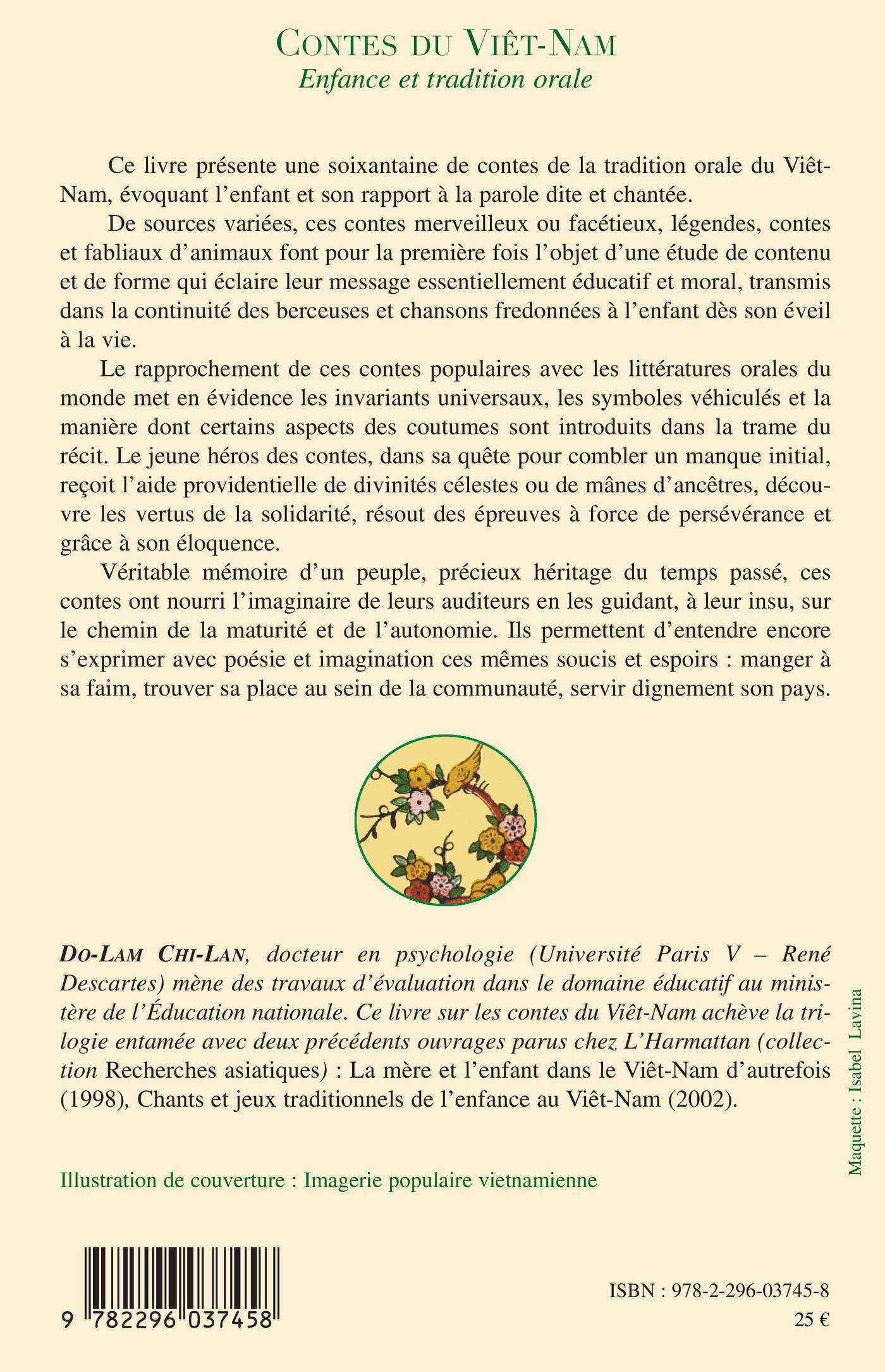 Les contes populaires de la tradition orale du Viêt-Nam présentés dans ce livre évoquent l'enfant et son rapport à la parole dite et chantée. Leur rapprochement avec les littératures du monde met en évidence les invariants symboliques véhiculés par le récit : la quête du héros pour combler un manque initial, l'aide providentielle, le merveilleux, les vertus de solidarité et de persévérance, la poursuite des mêmes soucis et espoirs -manger à sa faim, trouver sa place au sein de la communauté, servir dignement son pays...... Ce volume achève la trilogie entamée par "La mère et l'enfant dans le Viêt-Nam d'autrefois" (L'Harmattan, 1998) et "Chants et jeux traditionnels de l'enfance au Viêt-Nam" (L'Harmattan, 2002).