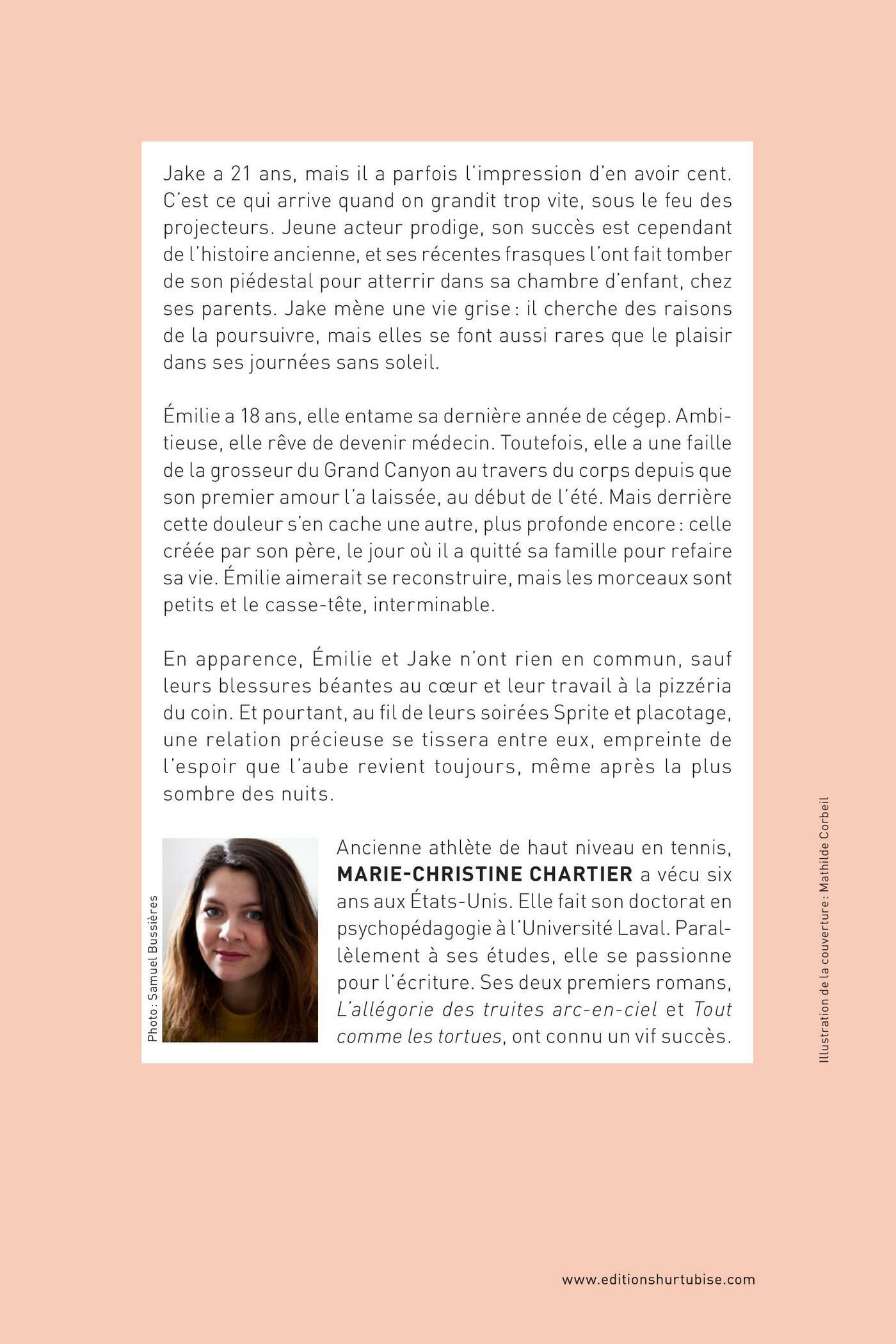 Jake a 21 ans, mais il a parfois l’impression d’en avoir cent. C’est ce qui arrive quand on grandit trop vite, sous le feu des projecteurs. Jeune acteur prodige, son succès est cependant de l’histoire ancienne, et ses récentes frasques l’ont fait tomber de son piédestal pour atterrir dans sa chambre d’enfant, chez ses parents. Jake mène une vie grise: il cherche des raisons de la poursuivre, mais elles se font aussi rares que le plaisir dans ses journées sans soleil.Émilie a 18 ans, elle entame sa dernière année de cégep. Ambitieuse, elle rêve de devenir médecin. Toutefois, elle a une faille de la grosseur du Grand Canyon au travers du corps depuis que son premier amour l’a laissée, au début de l’été. Mais derrière cette douleur s’en cache une autre, plus profonde encore: celle créée par son père, le jour où il a quitté sa famille pour refaire sa vie. Émilie aimerait se reconstruire, mais les morceaux sont petits et le casse-tête, interminable.En apparence, Émilie et Jake n’ont rien en commun, sauf leurs blessures béantes au cœur et leur travail à la pizzéria du coin. Et pourtant, au fil de leurs soirées Sprite et placotage, une relation précieuse se tissera entre eux, empreinte de l’espoir que l’aube revient toujours, même après la plus sombre des nuits.
