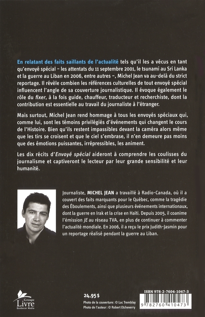 En relatant des faits saillants de l'actualité tels qu'il les a vécus en tant qu'envoyé spécial, Michel Jean va au-delà du strict reportage. Il révèle combien les références culturelles de tout envoyé spécial influencent l'angle de sa couverture journalistique. Il évoque également le rôle du "fixer", à la fois guide, chauffeur, traducteur et interprète. Mais surtout, Michel Jean rend hommage à tous les envoyés spéciaux qui, comme lui, sont les témoins privilégiés d'événements qui changent le cours de l'Histoire. Les dix récits d'Envoyé spécial aideront à comprendre les coulisses du journalisme et captiveront le lecteur par leur grande humanité.