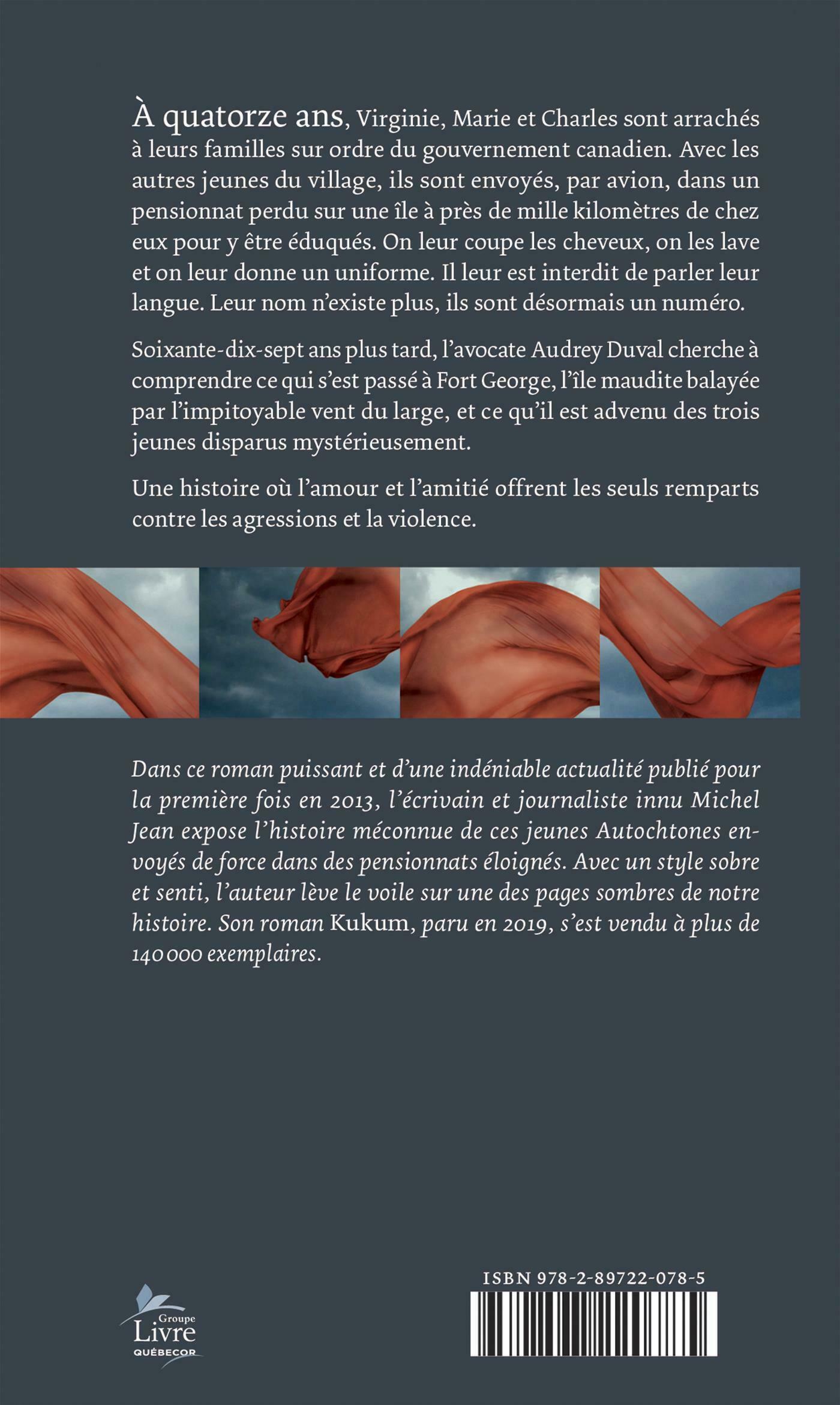 Dans ce roman publié pour la première fois en 2013, l'écrivain et journaliste innu Michel Jean expose l'histoire méconnue de ces jeunes Autochtones envoyés de force dans des pensionnats éloignés. Avec un style sobre et senti, l'auteur lève le voile sur une des pages sombres de notre histoire. Un livre puissant et d'une indéniable actualité.