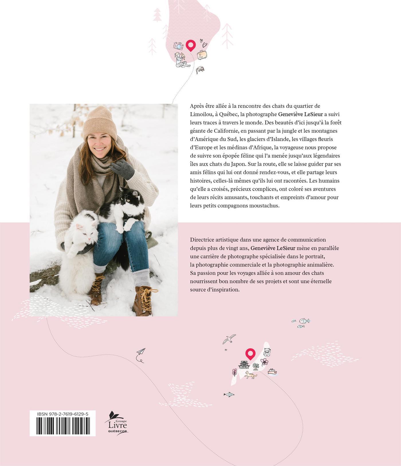 Après être allée à la rencontre des chats du quartier de Limoilou, à Québec, la photographe Geneviève LeSieur a suivi leurs traces à travers le monde. Des beautés d'ici jusqu'à la forêt géante de Californie, en passant par la jungle et les montagnes d'Amérique du Sud, les glaciers d'Islande, les villages fleuris d'Europe et les médinas d'Afrique, la voyageuse nous propose de suivre son épopée féline qui l'a menée jusqu'aux légendaires îles aux chats du Japon. Sur la route, elle se laisse guider par ses amis félins qui lui ont donné rendez-vous, et elle partage leurs histoires, celles-là mêmes qu'ils lui ont racontées. Les humains qu'elle a croisés, précieux complices, ont coloré ses aventures de leurs récits amusants, touchants et empreints d'amour pour leurs petits compagnons moustachus.