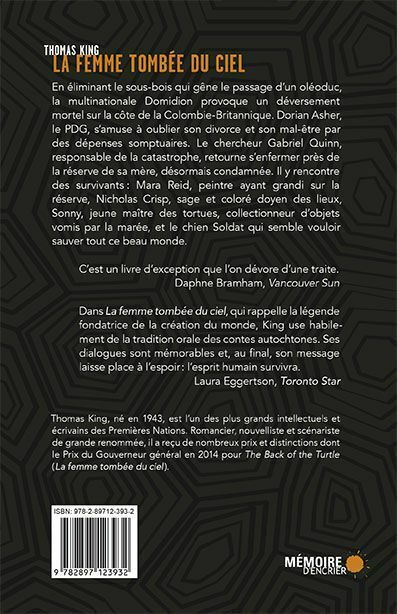 En éliminant le sous-bois qui gêne le passage d'un oléoduc, la multinationale Domidion provoque un déversement mortel sur la côte de la Colombie-Britannique. Dorian Asher, le PDG, s'amuse à oublier son divorce et son mal-être par des dépenses somptuaires. Le chercheur Gabriel Quinn, responsable de la catastrophe, retourne s'enfermer près de la réserve de sa mère, désormais condamnée. Il y rencontre des survivants : Mara Reid, peintre ayant grandi sur la réserve, Nicholas Crisp, sage et coloré doyen des lieux, Sonny, jeune maître des tortues, collectionneur d'objets vomis par la marée, et le chien Soldat qui semble vouloir sauver tout ce beau monde.