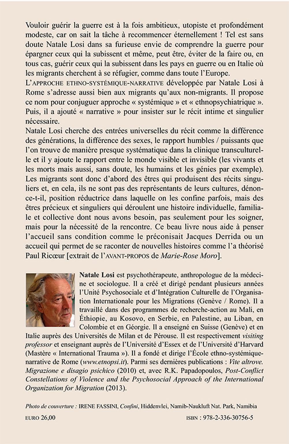 À partir de son expérience de psychothérapeute engagé dans la guerre, l'auteur démontre la nécessité, mais aussi la créativité, d'un accueil et d'un chemin avec tous ces migrants et leurs enfants là-bas dans la guerre ou ici, lorsqu'ils tentent de poser leurs valises. Ce beau livre nous aide à penser l'accueil sans condition. L'approche ethnosystémique narrative développée par Natale Losi à Rome s'adresse aussi bien aux migrants qu'aux non-migrants. Il propose ce nom pour conjuguer approche systémique et ethnopsychiatrique. Il a ajouté « narrative » pour insister sur le récit intime et singulier nécessaire et je trouve cette dénomination assez convaincante, elle y ajoute une dimension précieuse pour le travail clinique.