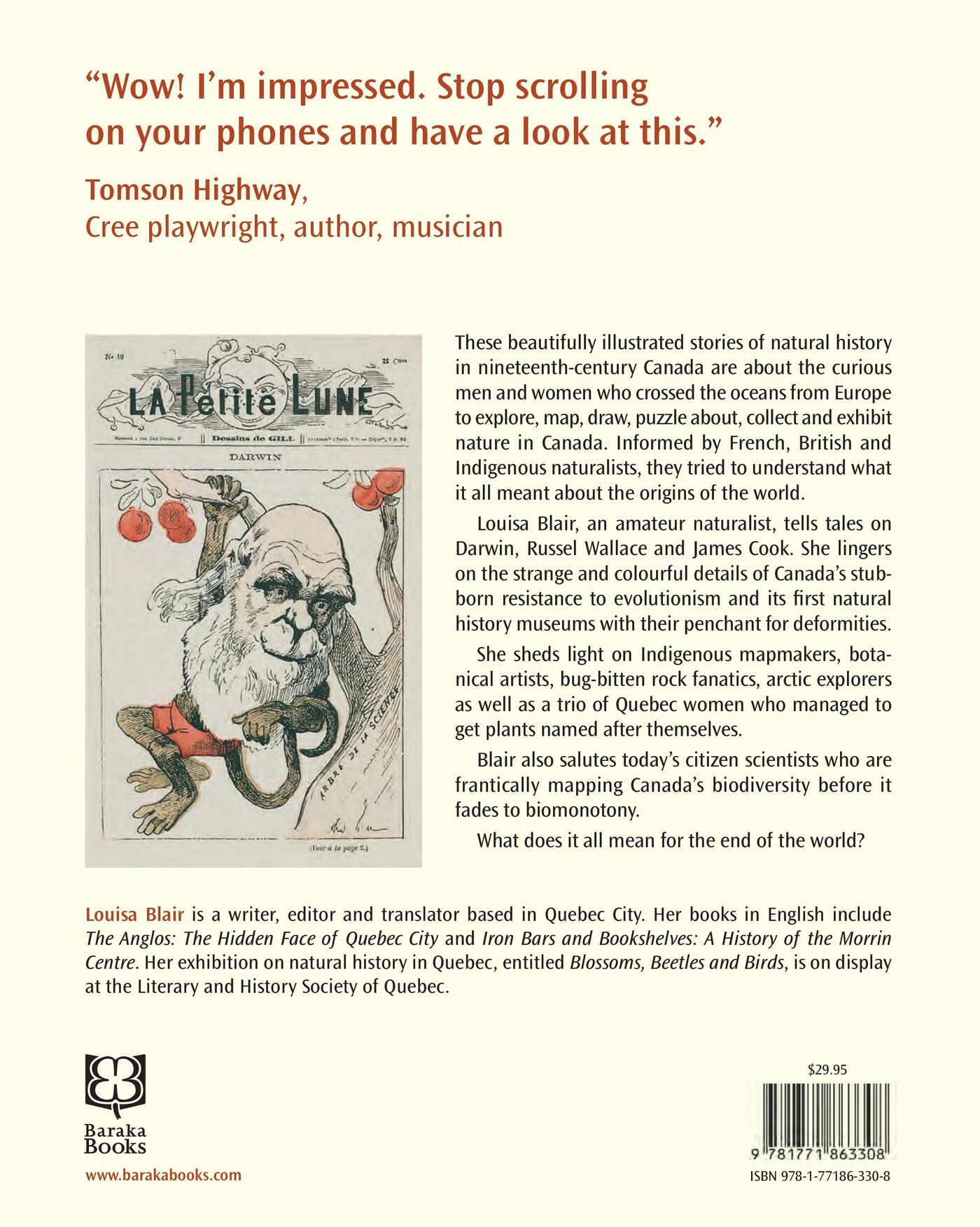 Muddy boots, cold hands, a pocket full of fossils, a mind full of existential questions.These beautifully illustrated stories of natural history in nineteenth-century Canada are about the curious men and women who crossed the oceans from Europe to explore, map, draw, puzzle about, collect and exhibit nature in Canada. Informed by French, British and Indigenous naturalists, they tried to understand what they saw.What did it all mean about the origins of the world?Louisa Blair, an amateur naturalist in Quebec and a transatlantic species herself, tells tales on Darwin, Russell Wallace and James Cook, and lingers on the strange and colourful details of Canada’s stubborn resistance to evolutionism and its first natural history museums with their penchant for deformities.Louisa Blair is writer, editor and translator who was born in Quebec City, raised in the UK, and returned to live in Quebec 25 years ago. Her books in English include The Anglos: The Hidden Face of Quebec City and Iron Bars and Bookshelves: A History of the Morrin Centre. She has also translated numerous books and exhibitions about history, culture and politics in Quebec. Her translation of Robert Lepage’s play 887 (House of Anansi Press, 2019) was nominated for a Governor General’s prize. Her exhibition on natural history in Quebec, entitled Blossoms, Beetles and Birds, is on display at the Literary and History Society of Quebec.Praise and Reviews“Wow! I’m impressed. Stop scrolling on your phones and have a look at this.” Tomson Highway, Cree playwright, author, musician“These stories about the passion for nature are an antidote to climate despair.” Jean-François Gauvin, Professor of Museum Studies and Scientific Heritage, Université LavalAbout Louisa Blair’s work“A captivating book.” Caroline Montpetit, Le Devoir, on The Anglos, The Hidden Face of Quebec“A loving and readable history” Brian Bethune, Macleans, on Iron Bars & Bookshelves“So good, so rich in anecdote and warm humanity, that it’s hard to capture its flavour in a few lines.” Morris Wolfe, Globe & Mail, on Louisa Blair’s 3-part investigative piece on Indigenous land rights in the James Bay, Catholic New Times, 1992.These stories feature Indigenous mapmakers, botanical artists, bug-bitten rock fanatics, arctic explorers, and a trio of Quebec women who managed to get plants named after themselves.Blair also salutes their successors, the citizen scientists who are now frantically mapping Canada’s biodiversity before it fades to bio-monotony.What does it all mean for the end of the world?
