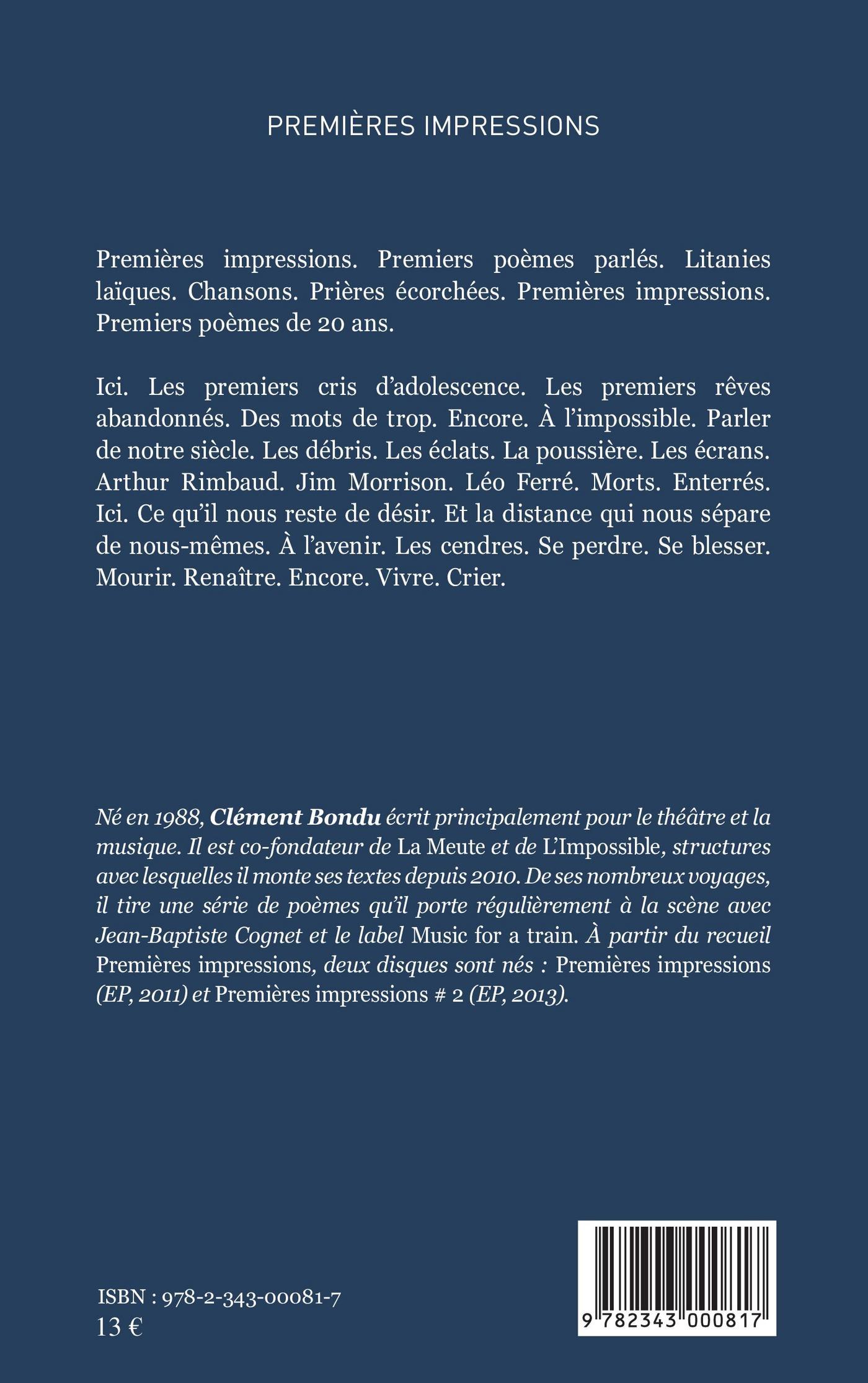 Premières impressions. Premiers poèmes parlés. Litanies laïques. Chansons. Prières écorchées. Premières impressions. Premiers poèmes de 20 ans. Ici. Les premiers cris d'adolescence. Les premiers rêves abandonnés. Des mots de trop. Encore. À l'impossible. Parler de notre siècle. Les débris. Les éclats. La poussière. Les écrans. Arthur Rimbaud. Jim Morrison. Léo Ferré. Morts. Enterrés. Ici. Ce qu'il nous reste de désir. Et la distance qui nous sépare de nous-mêmes. À l'avenir. Les cendres. Se perdre. Se blesser. Mourir. Renaître. Encore. Vivre. Crier.