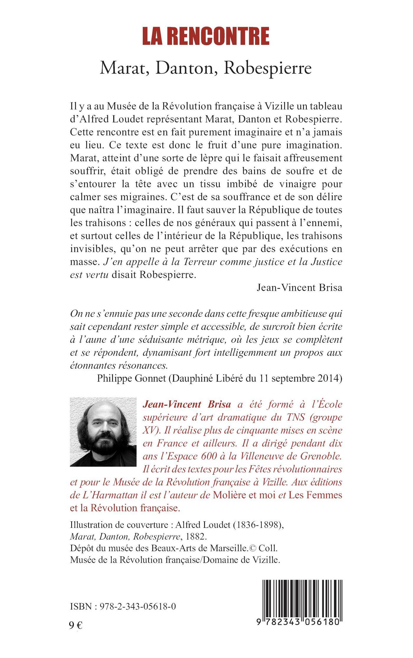 Il y a au Musée de la Révolution française à Vizille un tableau d'Alfred Loudet représentant Marat, Danton et Robespierre. Cette rencontre n'a jamais eu lieu. Ce texte est donc le fruit d'une pure imagination. Marat, atteint d'une sorte de lèpre qui le faisait affreusement souffrir, était obligé de prendre des bains de soufre et de s'entourer la tête avec un tissu imbibé de vinaigre pour calmer ses migraines. C'est de sa souffrance et de son délire que naîtra l'imaginaire. Il faut sauver la République de toutes les trahisons : celles de nos généraux qui passent à l'ennemi, et surtout celles de l'intérieur de la République, les trahisons invisibles, qu'on ne peut arrêter que par des exécutions en masse. J'en appelle à la Terreur comme justice et la Justice est vertu disait Robespierre.