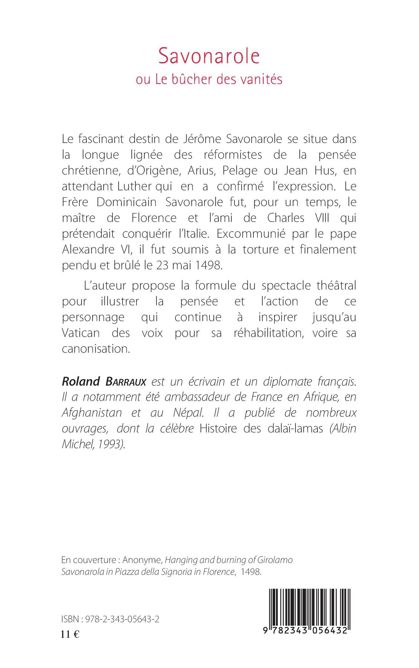 Le fascinant destin de Jérôme Savonarole se situe dans la longue lignée des réformistes de la pensée chrétienne, d'Origène, Arius, Pelage ou Jean Hus, en attendant Luther qui en a confirmé l'expression. Le Frère Dominicain Savonarole fut, pour un temps, le maître de Florence et l'ami de Charles VIII qui prétendait conquérir l'Italie. Excommunié par le pape Alexandre VI, il fut soumis à la torture et finalement pendu et brûlé le 23 mai 1498. L'auteur propose la formule du spectacle théâtral pour illustrer la pensée et l'action de ce personnage qui continue à inspirer jusqu'au Vatican des voix pour sa réhabilitation, voire sa canonisation.