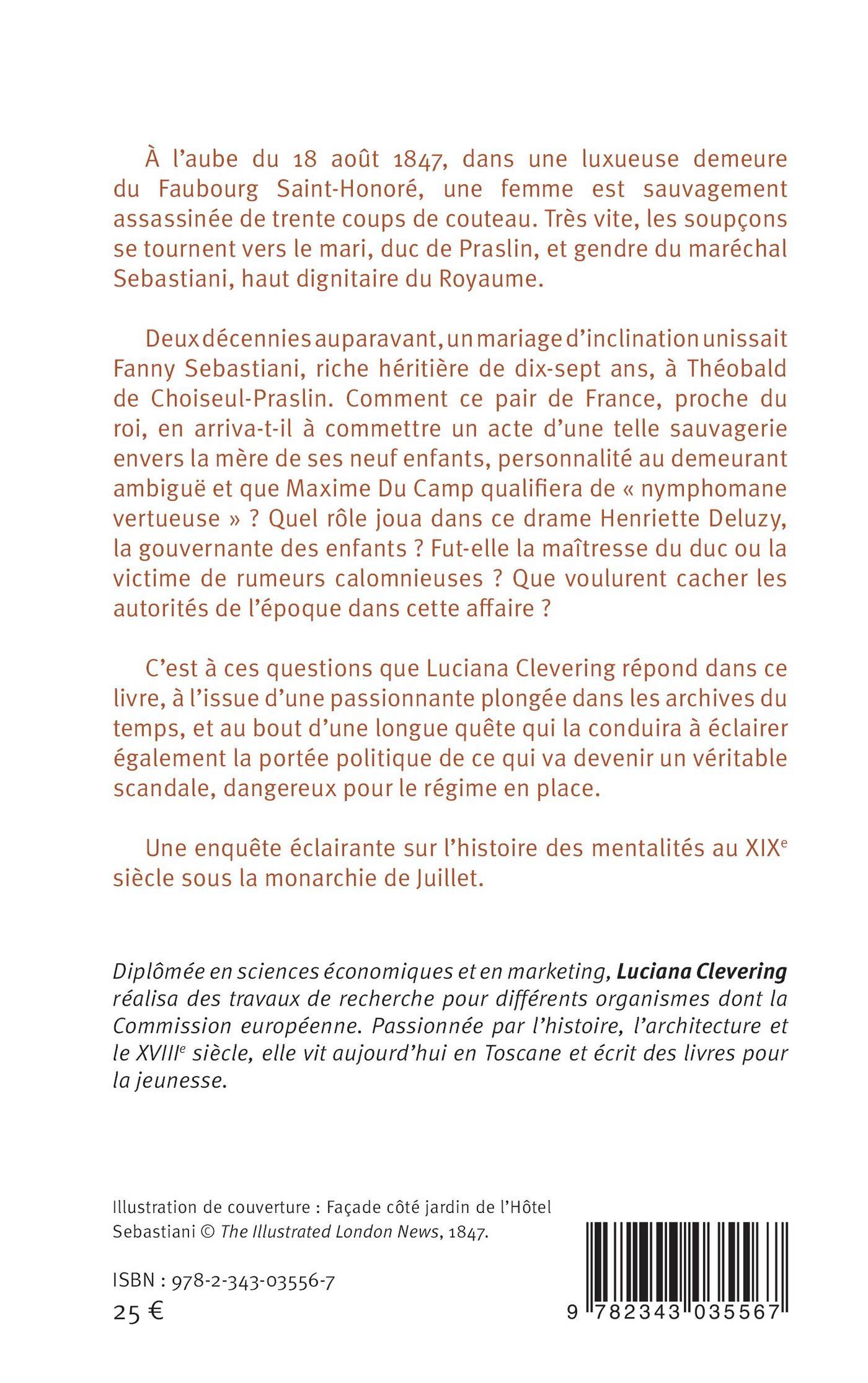 Le 18 août 1847, une femme est sauvagement assassinée de trente coups de couteau. Très vite, les soupçons se tournent vers le duc de Praslin, son mari et gendre du maréchal Sebastiani, haut dignitaire du Royaume : comment en arriva-t-il à commettre un acte d'une telle sauvagerie envers la mère de ses neuf enfants ? Quel rôle joua dans ce drame Henriette Deluzy, la gouvernante des enfants ? Que voulurent cacher les autorités sur cette affaire ? L'auteure vient éclairer la portée politique de ce qui va devenir un véritable scandale, dangereux pour le régime en place.
