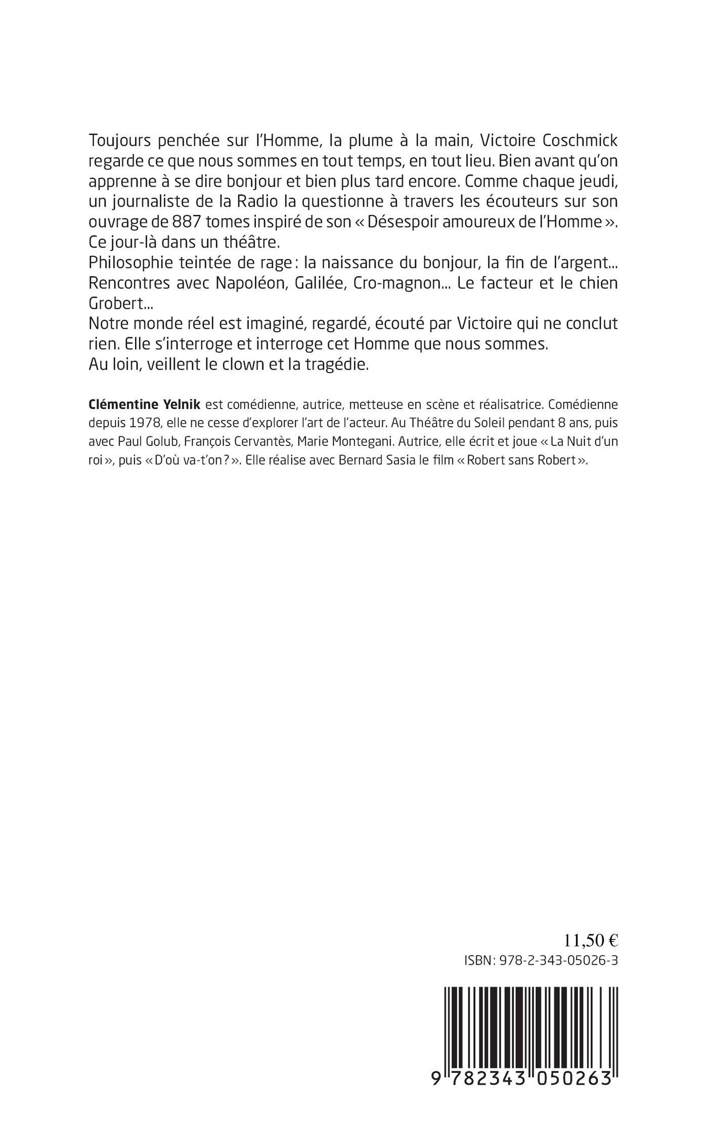 Toujours penchée sur l'Homme, la plume à la main, Victoire Coschmick regarde ce que nous sommes en tout temps, en tout lieu. Bien avant qu'on apprenne à se dire bonjour et bien plus tard encore. Comme chaque jeudi, un journaliste de la Radio la questionne sur son ouvrage de 887 tomes inspiré de son "Désespoir amoureux de l'Homme". Ce jour-là dans un théâtre. Philosophie teintée de rage : la naissance du bonjour, la fin de l'argent... Rencontres avec Napoléon, Galilée, Cro-Magnon...Notre réel est imaginé, regardé, écouté par Victoire qui ne conclut rien. Elle s'interroge et interroge cet Homme que nous sommes. Au loin, veillent le clown et la tragédie.