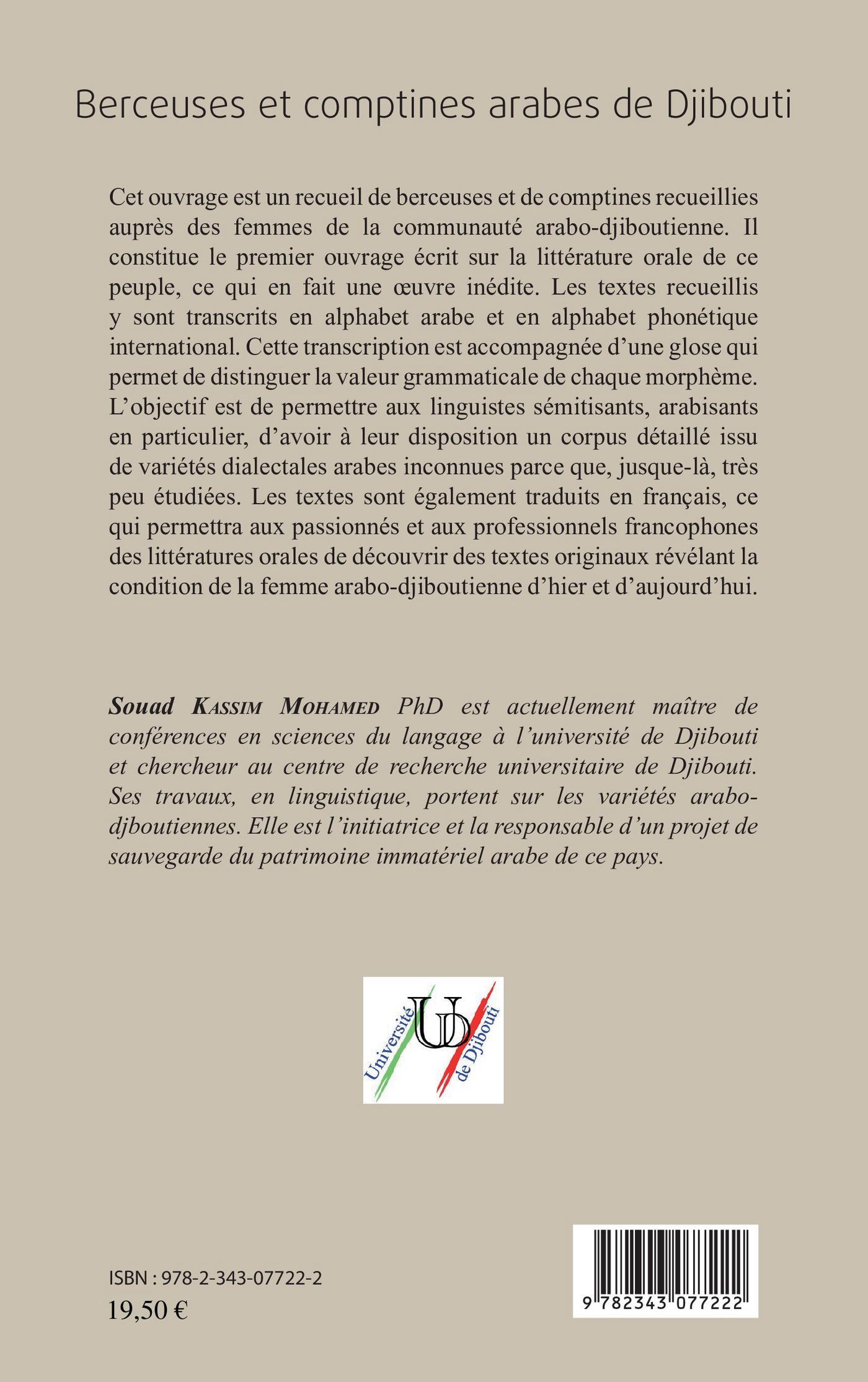 Cet ouvrage est un recueil de berceuses et comptines recueillies auprès des femmes de la communauté arabo-djiboutienne. Il constitue le premier ouvrage écrit sur la littérature orale de ce peuple, ce qui en fait une oeuvre inédite. Les textes recueillis y sont transcrits en alphabet arabe et en alphabet phonétique international, et également traduits en français. Voici une opportunité pour les passionnés de littérature orale de découvrir des textes originaux révélant la condition de la femme arabo-djiboutienne d'hier et d'aujourd'hui.