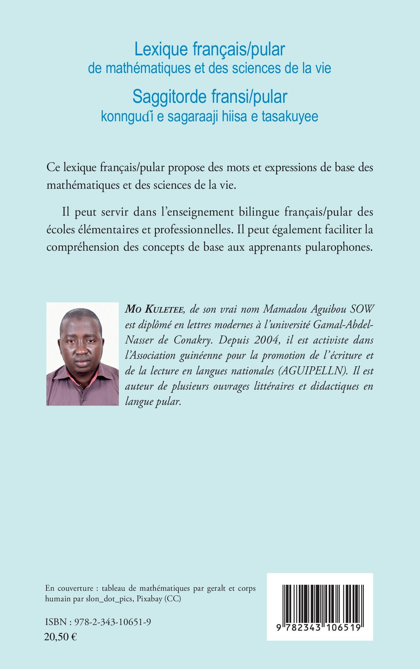 Ce lexique français / pular propose des mots et expressions de base des mathématiques et des sciences de la vie. Il peut servir dans l'enseignement bilingue français / pular des écoles élémentaires et professionnelles et faciliter la compréhension des concepts de base aux apprenants pularophones.