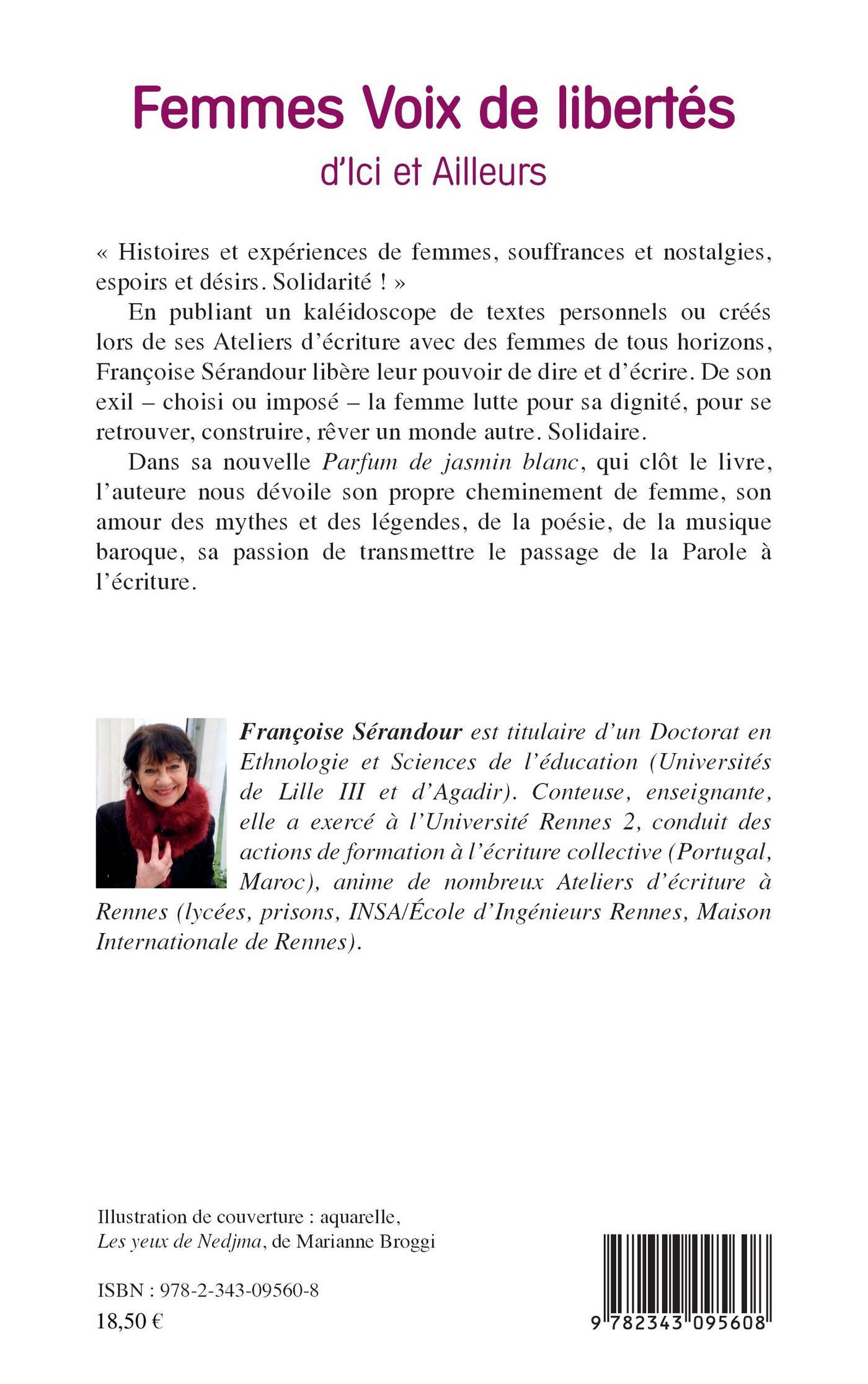 « Histoires et expériences de femmes, souffrances et nostalgies, espoirs et désirs. Solidarité ! » En publiant un kaléidoscope de textes personnels ou créés lors de ses Ateliers d'écriture avec des femmes de tous horizons, l'auteure libère leur pouvoir de dire et d'écrire. De son exil - choisi ou imposé- la femme lutte pour sa dignité, pour se retrouver, construire, rêver un monde autre. Dans sa nouvelle Parfum de jasmin blanc, l'auteure nous dévoile son propre cheminement de femme, son amour des mythes et des légendes, de la poésie, de la musique baroque, sa passion de transmettre le passage de la Parole à l'écriture.