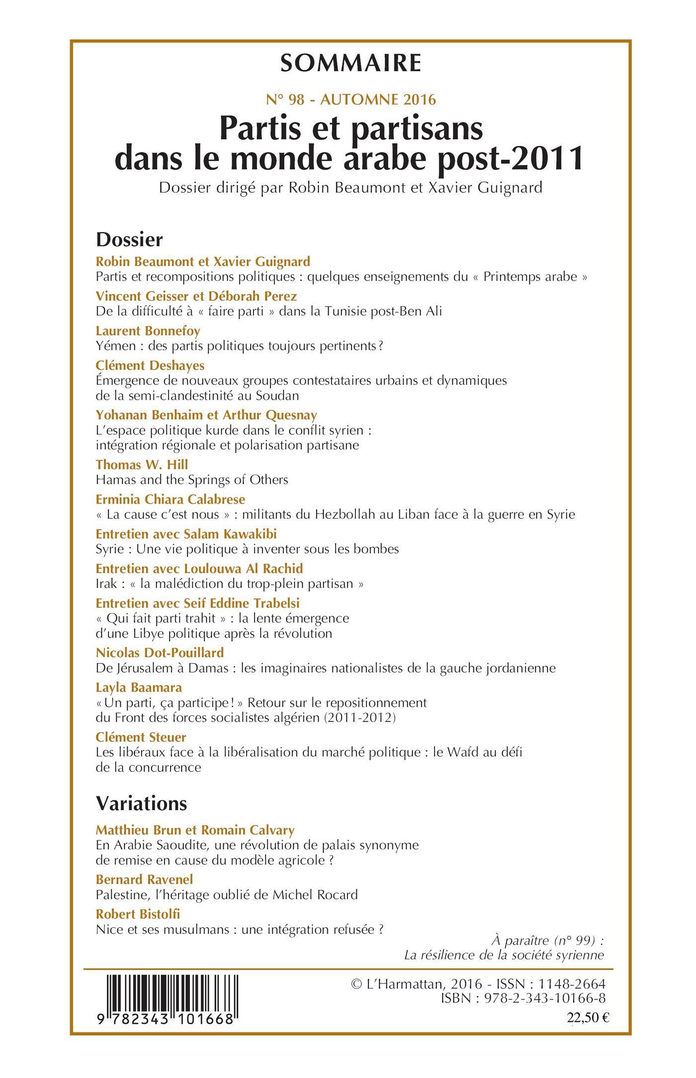 Joni Aasi, Dima Alsajdeya, Pierre Bourgois, Laetitia Bucaille, Jean-Paul Chagnollaud, Alain Dieckhoff, Kamel Doraï, Jean-Pierre Filiu, Xavier Guignard, Sabine Jansen, Taher Labadi, Jean Mendelson, Nitzan Perelman, Sbeih Sbeih, Julie Trottier, Amaury Lorin, Henry Laurens, Insaf Rezagui, David Elkaim, Johann Soufi, Sarah Daoud