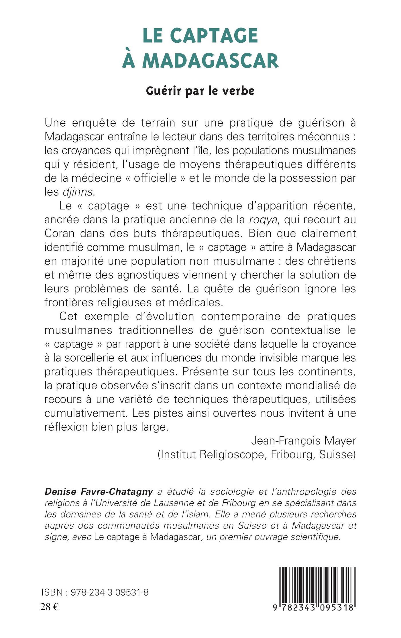 Cet ouvrage s'appuie sur un travail de terrain visant à étudier une pratique de guérison à Madagascar : le "captage". Technique d'apparition récente, qui recourt au Coran dans des buts thérapeutiques, le "captage" attire à Madagascar une population majoritairement non-musulmane : des chrétiens et même des agnostiques viennent y chercher la solution à leurs problèmes de santé. Cette pratique insolite, pourtant présente sur tous les continents, s'inscrit dans un contexte mondialisé de recours à une variété de techniques thérapeutiques utilisées cumulativement. Les pistes ainsi ouvertes nous invitent à une réflexion bien plus large.