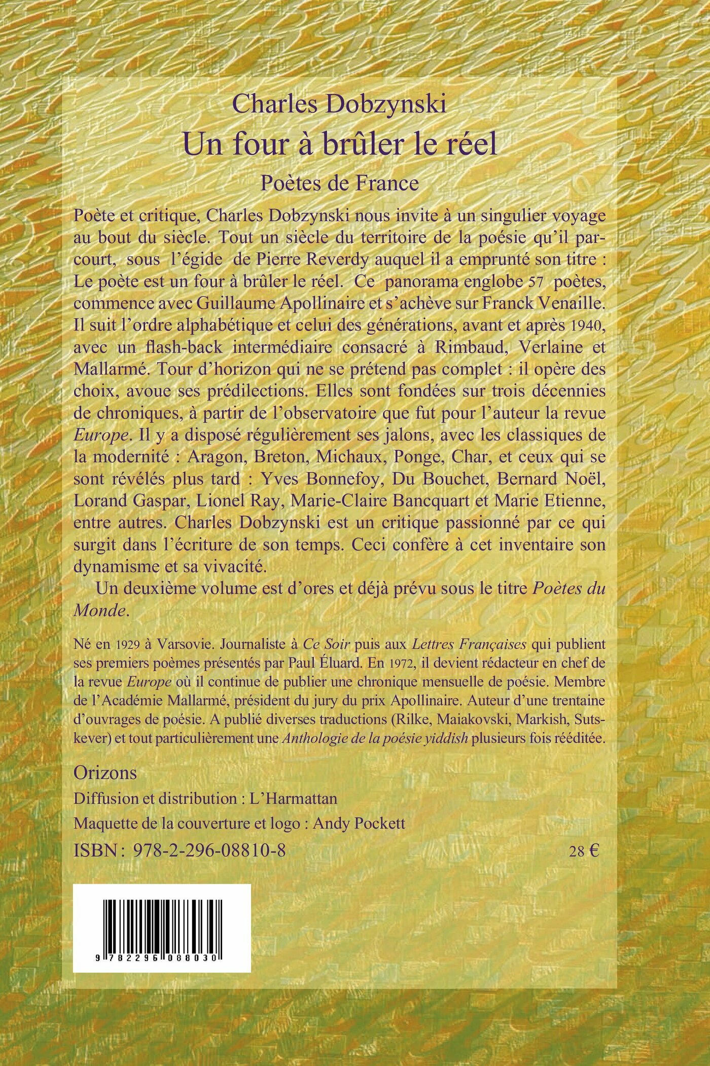 Poète et critique, Charles Dobzynski nous invite à un singulier voyage au bout du siècle. Tout un siècle du territoire de la poésie qu'il parcourt, sous l'égide de Pierre Reverdy auquel il a emprunté son titre : « Le poète est un four à brûler le réel ». Ce panorama englobe 57 poètes, commence avec Guillaume Apollinaire et s'achève sur Franck Venaille. Il suit l'ordre alphabétique et celui des générations, avant et après 1940, avec un flash-back intermédiaire consacré à Rimbaud, Verlaine et Mallarmé. Tour d'horizon qui ne se prétend pas complet : il opère des choix, avoue ses prédilections. Elles sont fondées sur trois décennies de chroniques, à partir de l'observatoire que fut pour l'auteur la revue Europe. Il y a disposé régulièrement ses jalons, avec les classiques de la modernité.