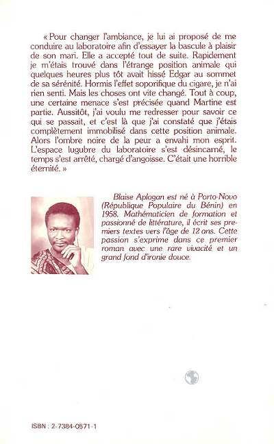« Pour changer l'ambiance, je lui ai proposé de me conduire au laboratoire afin d'essayer la bascule à plaisir de son mari. Elle a accepté tout de suite. Rapidement je m'étais trouvé dans l'étrange position animale qui quelques heures plus tôt avait hissé Edgar au sommet de sa sérénité. Hormis l'effet soporifique du cigare, je n'ai rien senti. Mais les choses ont vite changé. Tout à coup, une certaine menace s'est précisée quand Martine est partie. Aussitôt, j'ai voulu me redresser pour savoir ce qui se passait, et c'est là que j'ai constaté que j'étais complètement immobilisé dans cette position animale. Alors l'ombre noire de la peur a envahi mon esprit. L'espace lugubre du laboratoire s'est désincarné, le temps s'est arrêté, chargé d'angoisse. C'était une horrible éternité. »