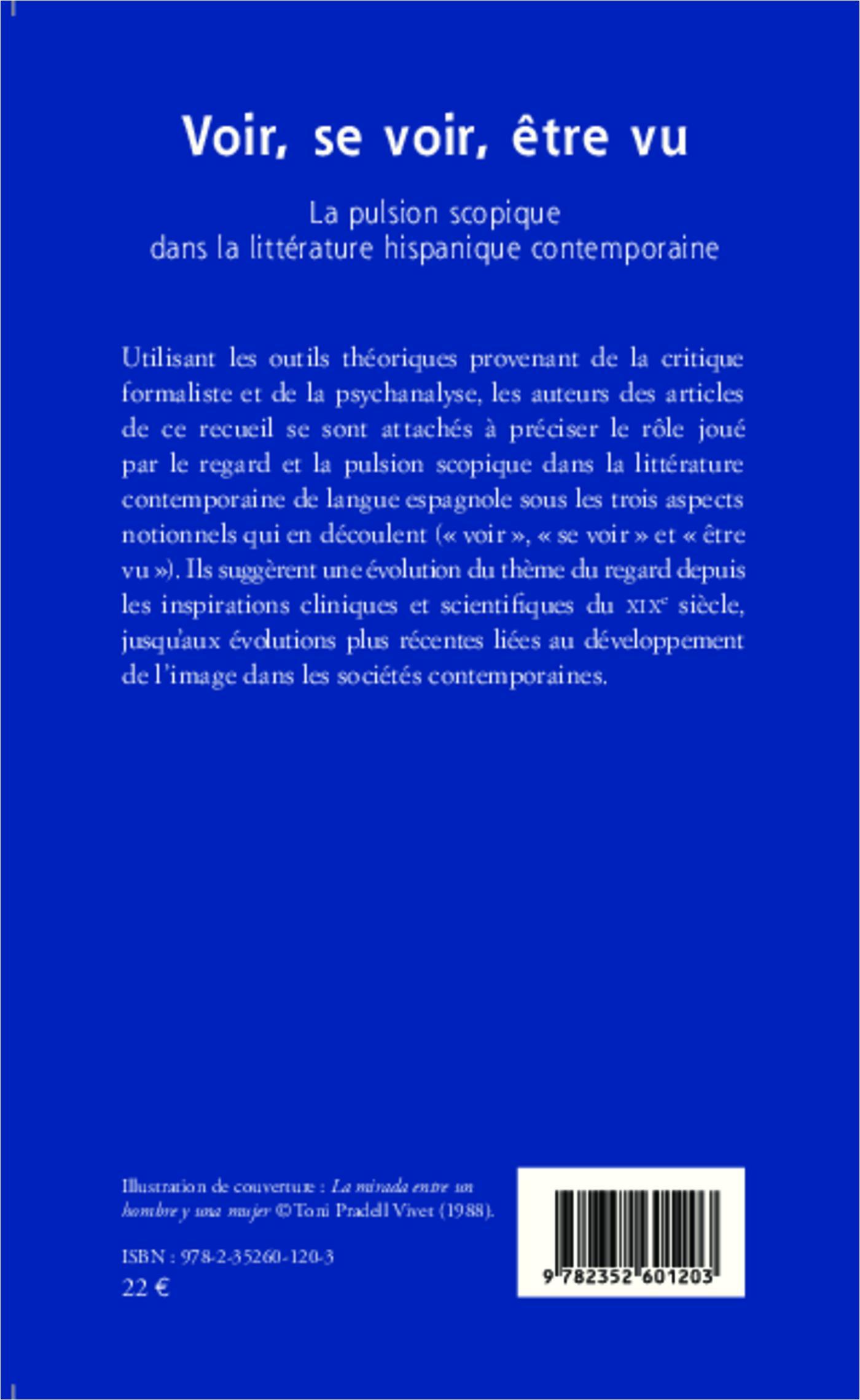 Utilisant les outils théoriques provenant de la critique formaliste et de la psychanalyse, les auteurs des articles de ce recueil se sont attachés à préciser le rôle joué par le regard et la pulsion scopique dans la littérature contemporaine de langue espagnole sous les trois aspects qui en découlent ("voir", "se voir" et "être vu"). Ils suggèrent une évolution du thème du regard depuis les inspirations cliniques et scientifiques du XIXe siècle, jusqu'aux évolutions plus récentes liées au développement de l'image dans les sociétés contemporaines.