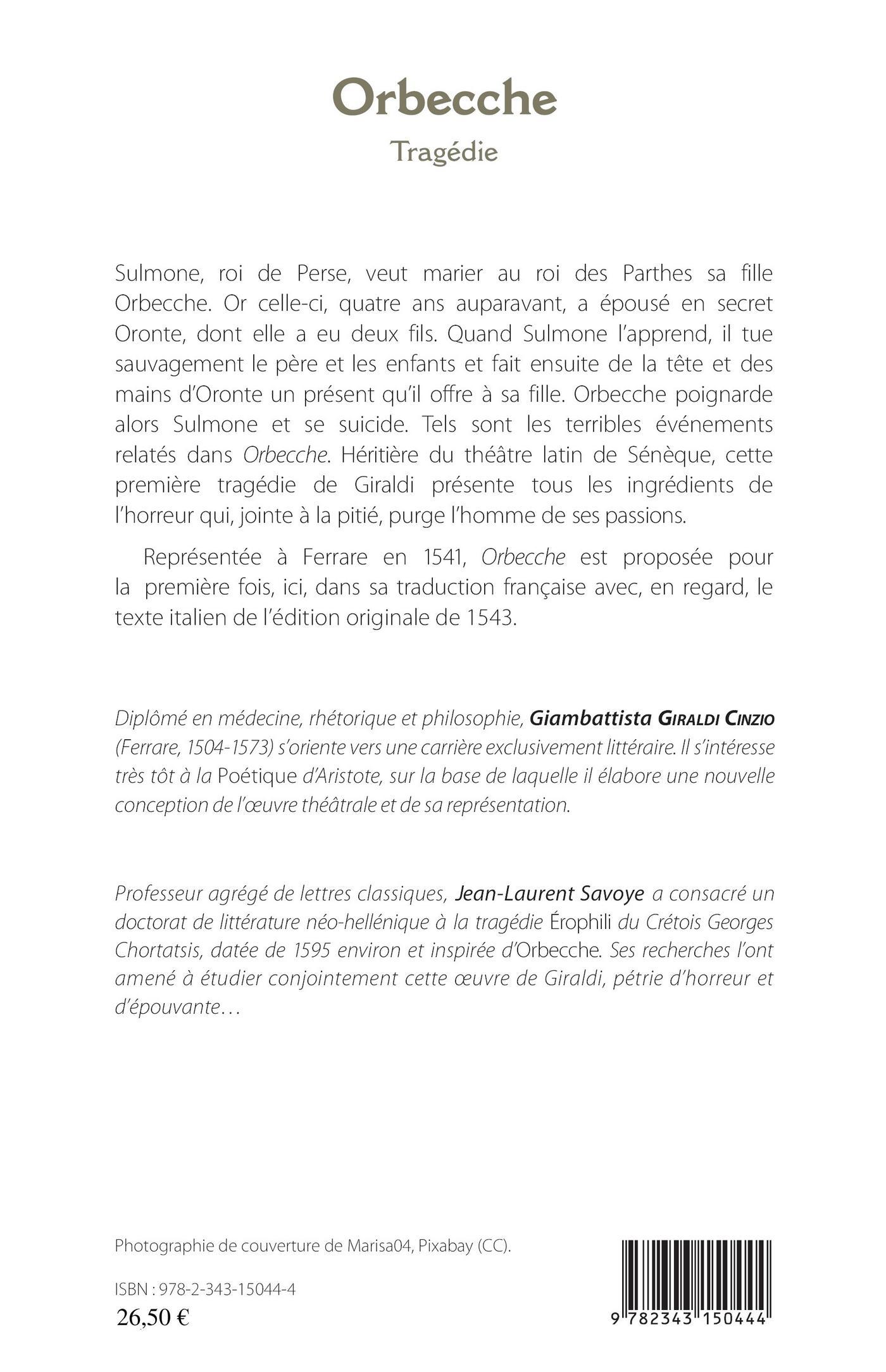 Sulmone, roi de Perse, veut marier au roi des Parthes sa fille Orbecche. Or celle-ci, quatre ans auparavant, a épousé en secret Oronte, dont elle a eu deux fils. Quand Sulmone l'apprend, il tue sauvagement, le père et les enfans et fait ensuite de la tête et des mains d'Oronte un présent qu'il offre à sa fille. Orbecche poignarde alors Sulmone et se suicide. Tels sont les terribles événements relatés dans Orbecche. Héritière du théâtre latin de Sénèque, cette première tragédie de Giraldi présente tous les ingrédients de l'horreur qui, jointe à la pitié, purge l'homme de ses passions. Représenté à Ferrare en 1541, Orbecche est proposée pour la première fois, ici, dans sa traduction française avec, en regard, le texte italien de l'édition originale de 1543.