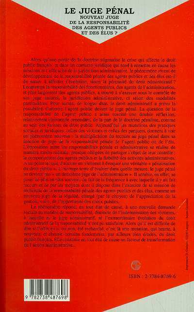 Alors qu'une partie de la doctrine stigmatise la crise qui affecte le droit public français, et dans un contexte juridique qui tend à renforcer en cause les missions et l'efficacité de la juridiction administrative, le phénomène récent de l'accroissement de la responsabilité pénale des agents publics et des élus est-il de nature à affecter l'évolution, sinon la pérennité du droit administratif ? A priori, la responsabilité des fonctionnaires, des agents de l'administration et plus largement des agents publics, a trouvé à s'exercer sous le contrôle de son juge naturel : la juridiction administrative, et selon des modalités particulières. Pour autant, de longue date, le droit administratif a prévu la possibilité d'attraire l'agent public devant le juge pénal. La question de la responsabilité de l'agent public a ainsi suscité une double réflexion : expression classique et juridique, celle des victimes et celle, de manière plus ou sein des juristes, de droit public. Aujourd'hui les mutations des pratiques sociales et juridiques, celles des victimes et celles, des juristes, donnent à voir un phénomène nouveau : la multiplication du recours au juge pénal dans ce domaine, même radical, et plus de la responsabilité pénale de l'agent public ou de l'élu. L'opposition entre les responsabilités pénale et administrative se réalise de manière moins radicale, presque oblitère, de même. Pourtant, nul n'ignore que le comportement des agents publics et la fiabilité des activités administratives sont au point de vue d'ancienneté l'objet de leur contrôle, sinon du droit public. L'ouvrage tente d'évaluer dans quelle mesure le juge pénal ne devient pas « un deuxième juge de l'administratif », ni l'« exterminateur » de celui-ci. Il semble, en effet, se poser de plus en plus souvent du fait de la fréquence à avec laquelle il y a fait recours et de par les moyens dont il dispose dans l'exercice de sa mission de recherche de la responsabilité pénale des agents publics et des élus, comme un nouveau juge de la légalité chargé par le citoyen de l'appréciation de la gestion, voire, de l'opportunité des choix publics.