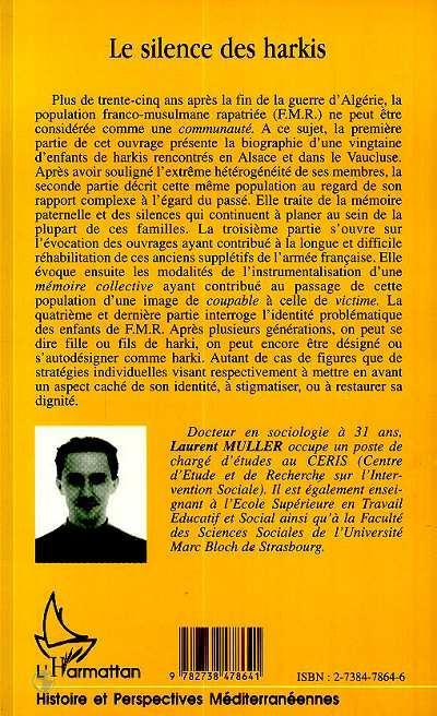 Plus de trente-cinq ans après la fin de la guerre d'Algérie, la population franco-musulmane rapatriée (F.M.R.) ne peut être considérée comme une communauté. A ce sujet, la première partie çle cet ouvrage présente la biographie d'une vingtaine d'enfants de harkis rencontrés en Alsace et dans le Vaucluse. Après avoir souligné l'extrême hétérogénéité de ses membres, la seconde partie décrit cette même population au regard de son rapport complexe à l'égard du passé. Elle traite de la mémoire paternelle et des silences qui continuent à planer au sein de la plupart de ces familles. La troisième partie s'ouvre sur l'évocation des ouvrages ayant contribué à la longue et difficile réhabilitation de ces anciens supplétifs de l' armée française. Elle évoque ensuite les modalités de l'instrumentalisation d'une mémoire collective ayant contribué au passage de cette population d'une image de coupable à celle de victime. La quatrième et dernière partie interroge l'identité problématique des enfants de F.M.R. Après plusieurs générations, on peut se dire fille ou fils de harki, on peut encore être désigné ou s'autodésigner comme harki. Autant de cas de figures que de stratégies individuelles visant respectivement à mettre en avant un aspect caché de son identité, à stigmatiser, ou à restaurer sa dignité.