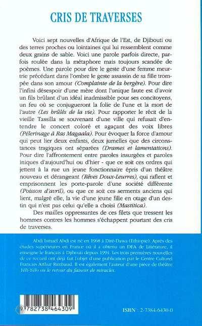 Voici sept nouvelles d'Afrique de l'Est, de Djibouti ou des terres proches ou lointaines qui lui ressemblent comme deux grains de sable. Voici une parole parfois directe, parfois roulée dans la métaphore mais toujours scandée de poèmes. Une parole pour dire le geste d'une femme meurtrie précédant dans l'ombre le geste assassin de sa fille trompée dans son amour (Complainte de la bergère). Pour dire l'infini désespoir d'une mère dont l'unique faute est d'avoir un fils brûlant d'un idéal inadmissible pour ses concitoyens, un feu où se conjugueront la folie de l'une et la mort de l'autre (Les brûlés de la vie).