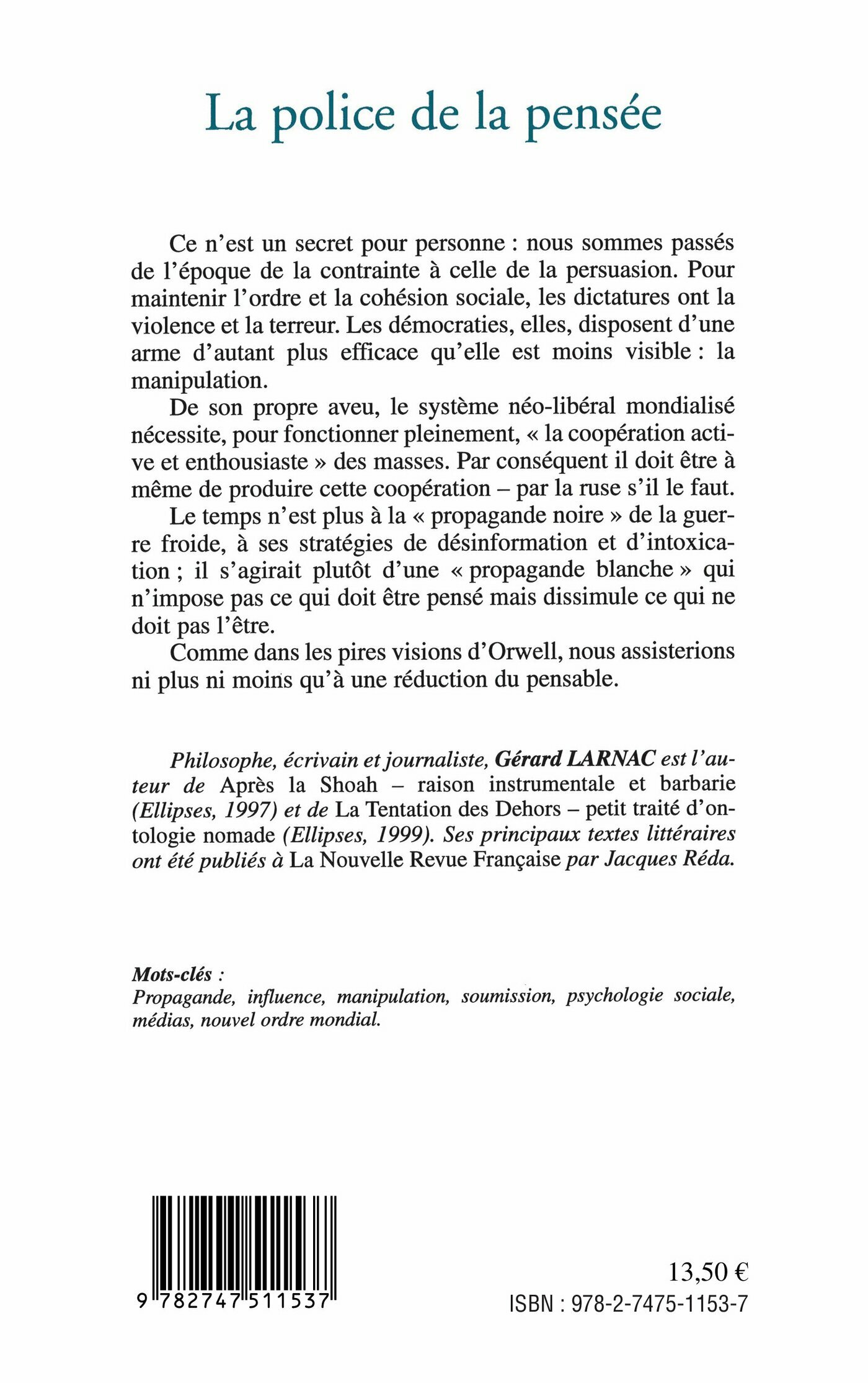Ce n'est un secret pour personne : nous sommes passés de l'époque de la contrainte à celle de la persuasion. Pour maintenir l'ordre et la cohésion sociale, les dictatures ont la violence et la terreur. Les démocraties, elles, disposent d'une arme d'autant plus efficace qu'elle est moins visible : la manipulation. Le temps n'est plus à la propagande " noire " de la guerre froide, à ses stratégies de désinformation et d'intoxication ; il s'agit plutôt d'une " propagande blanche " qui n'impose pas ce qui doit être pensé mais dissimule ce qui ne doit pas l'être. Comme les pire visions d'Orwell, nous assisterions ni plus ni moins qu'à une réduction du pensable.