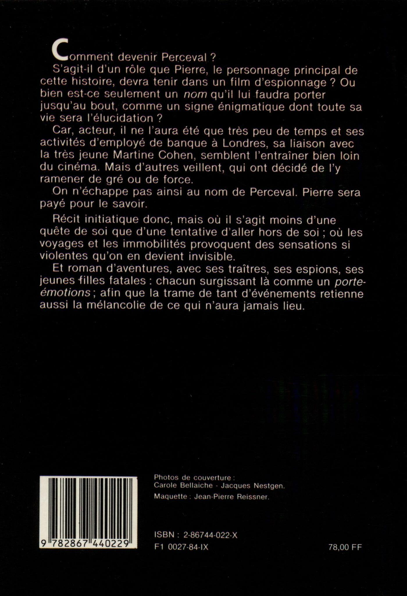 Comment devenir Perceval? S'agit-il d'un rôle que Pierre, le personnage principal de cette histoire, devra tenir dans un film d'espionnage? Ou bien est-ce seulement un nom qu'il lui faudra porter jusqu'au bout, comme un signe énigmatique dont toute sa vie sera l'élucidation? Car, acteur, il ne l'aura été que très peu de temps et ses activités d'employé de banque à Londres, sa liaison avec la très jeune Martine Cohen, semblent l'entraîner bien loin du cinéma. Mais d'autres veillent qui ont décidé de l'y ramener de gré ou de force. Récit initiatique donc, mais où il s'agit moins d'une quête de soi que d'une tentative pour aller hors de soi ; où les voyages et les immobilités provoquent des sensations si violentes qu'on en devient invisible.
