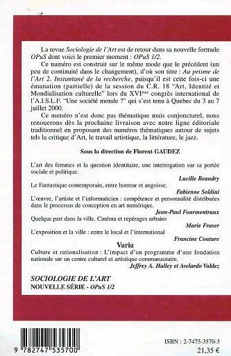 La revue Sociologie de l'art est de retour dans sa nouvelle formule OPuS dont voici le premier moment : OPuS 1/2.Ce numéro est construit sur le même mode que le précédent (un peu de continuité dans le changement), d'où son titre : Au prisme de l'art 2. Instantané de recherche, puisqu'il est cette fois-ci une émanation (partielle) de la session du CR 18 "Art, identité et mondialisation culturelle" lors du XVIème congrès international de l'AISLF "Une société monde ?", qui s'est tenu à Québec du 3 au 7 juillet 2000.Ce numéro n'est donc pas thématique mais conjoncturel, nous renouerons dès la prochaine livraison avec notre ligne éditoriale traditionnelle en proposant des numéros thématiques autour de sujets tels que la critique d'art, le travail artistique, la littérature, le jazz.