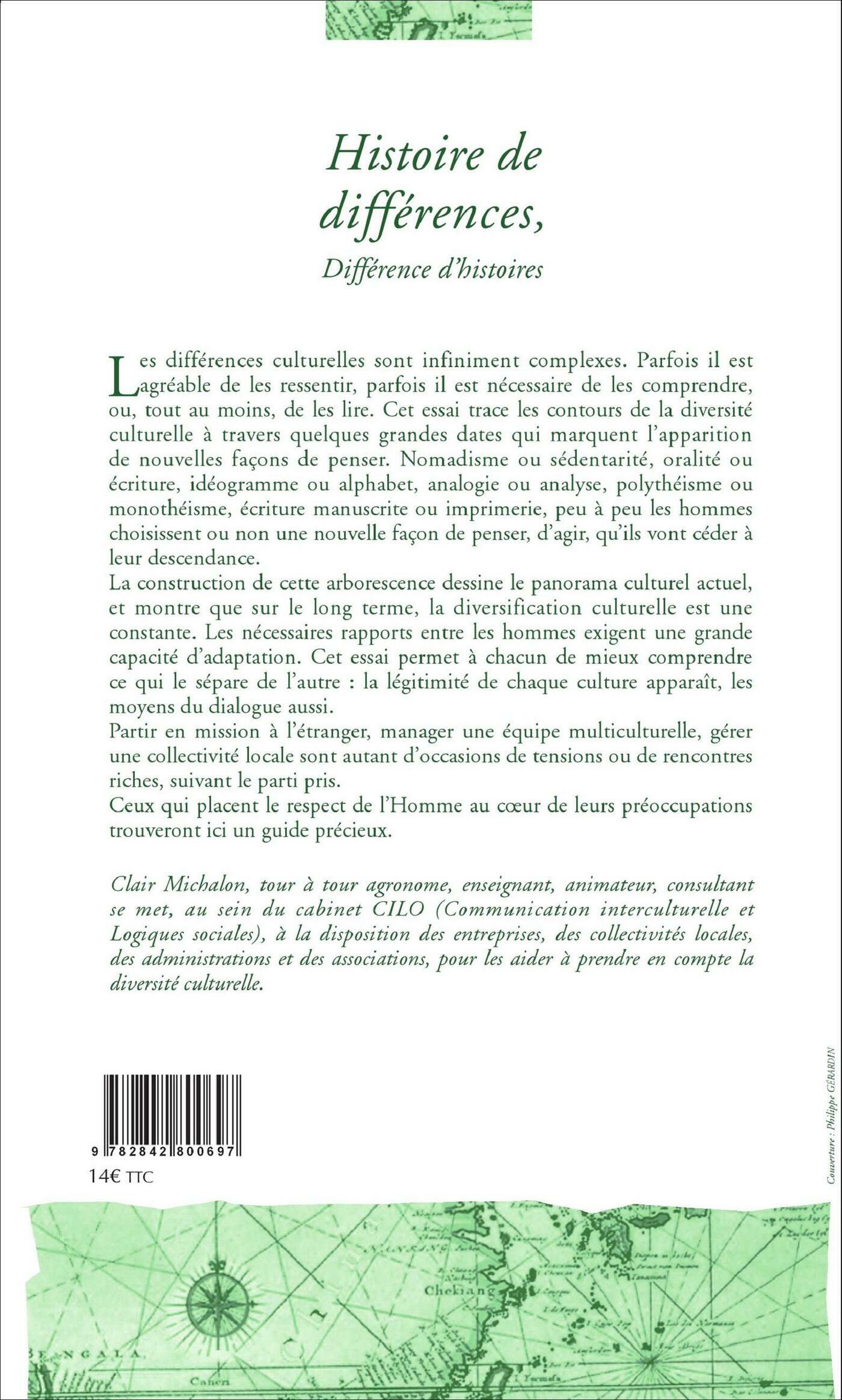 Les différences culturelles sont infiniment complexes. Parfois il est agréable de les ressentir, parfois il est nécessaire de les comprendre, ou, tout au moins, de les lire. Cet essai trace les contours de la diversité culturelle à travers quelques grandes dates qui marquent l'apparition de nouvelles façons de penser. Nomadisme ou sédentarité, oralité ou écriture idéogramme ou alphabet, analogie ou analyse, polythéisme ou monothéisme, écriture manuscrite ou imprimerie, peu à peu les hommes choisissent ou non une nouvelle façon de penser, d'agir, qu'ils vont céder à leur descendance...