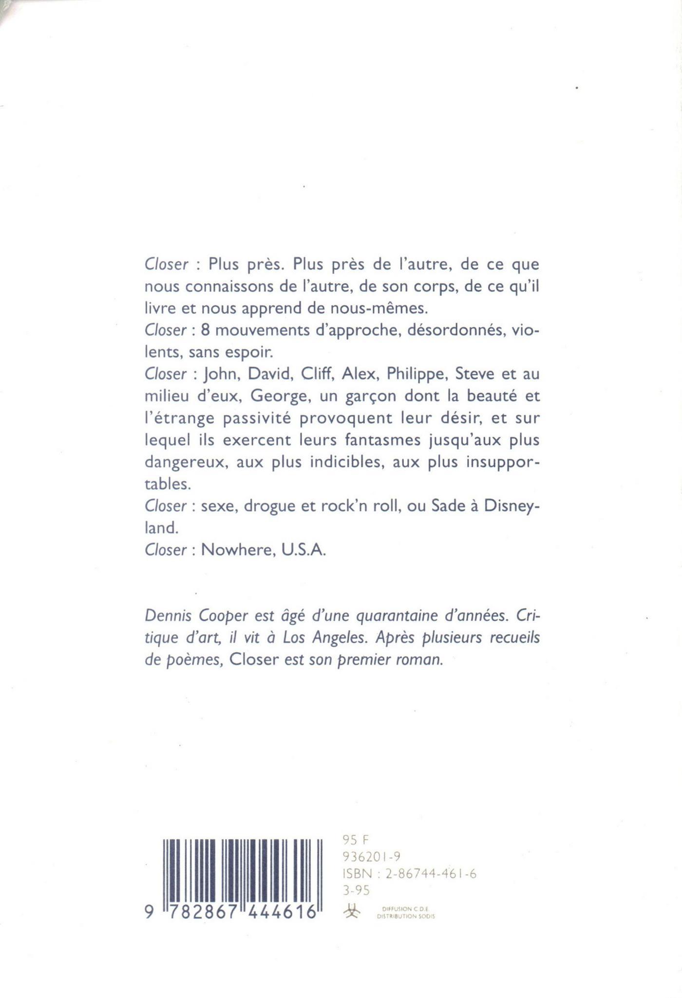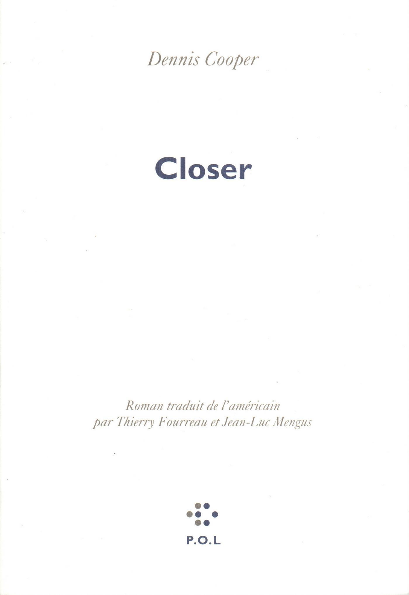 La beauté de George Miles et son étrange passivité en font l'objet des désirs de son entourage. L'un après l'autre, ces garçons (John, David, Cliff, Alex, Philippe, Steve), produits typiques d'une Amérique moyenne déboussolée, vont le soumettre à leurs fantasmes. Dans une suite d'expériences de plus en plus extrêmes, à la limite du supportable, ils vont essayer, chacun à leur manière, de découvrir ce qui se cache derrière son apparence, ce qui se dissimule à l'intérieur même de cette image, quitte à le chercher littéralement sous la peau... Ce premier roman de Dennis Cooper, publié aux États-Unis en 1989, est une descente terrifiante dans les obsessions de l'Amérique contemporaine, un train fantôme dévalant les pentes du désir et plongeant vers la mort sur fond de rock'n'roll, le récit d'un Sade transporté à Disneyland. Tous repères effondrés, toute morale abolie, ses personnages semblent évoluer dans une dimension parallèle dont le sexe, la drogue et les films d'horreur de série Z seraient les dernières balises. Parmi eux, la figure 'angélique' de George apparaît comme le déclencheur qui leur permet de découvrir et de repousser leurs limites. Closer est un livre très dur, très violent. L'un de ceux qui convoquent de véritables sentiments de fascination et de répulsion. Son originalité réside dans une structure singulière – huit chapitres indépendants (comme de courtes nouvelles), rassemblés par un dénominateur commun, George qui les traverse en voyageur halluciné – et d'autre part, dans le style de Dennis Cooper, étonnament minimaliste, presque clinique, tant il est volontairement dépourvu d'émotions, d'effets. De la confrontation de ce laconisme, du rythme brisé de courts paragraphes qui évoquent les plans-séquences d'un film (l'auteur cite Robert Bresson comme l'une de ses influences), appliqués sinon opposés à un thème littéralement monstrueux, catalogue irraisonné de fantasmes, de perversions, naît un roman extrêmement perturbant qui s'inscrit dans un mouvement de renouvellement de la fiction aux États-Unis.