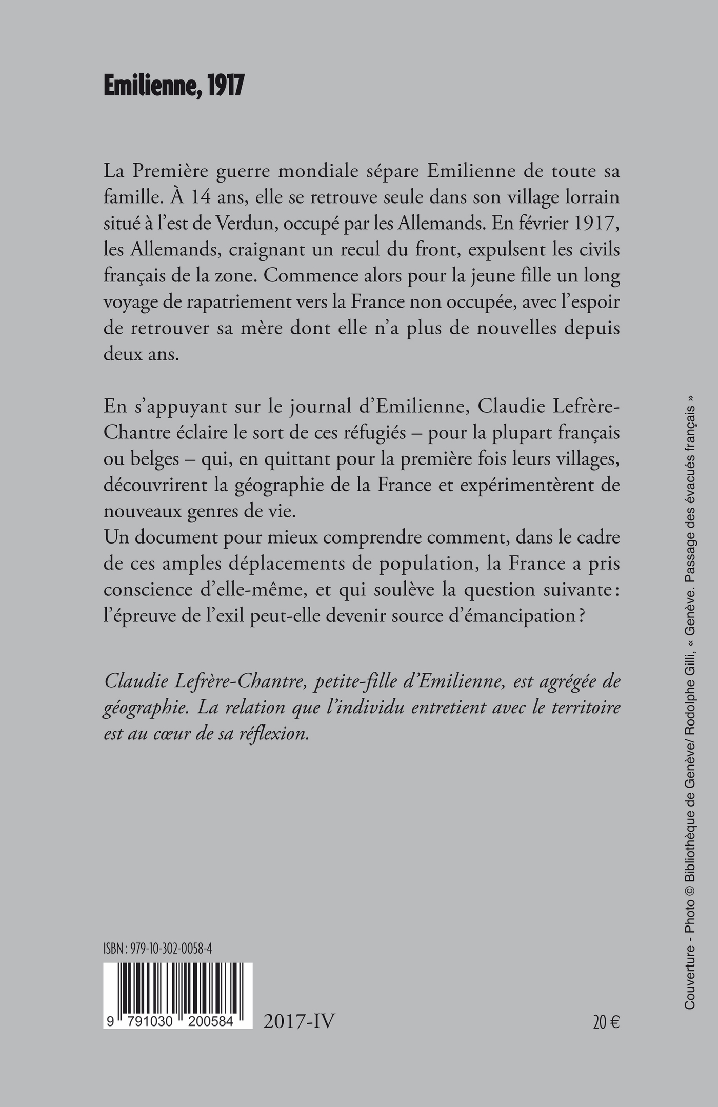 La Première guerre mondiale sépare Emilienne de toute sa famille. À 14 ans, elle se retrouve seule dans son village lorrain situé à l'est de Verdun, occupé par les Allemands. En février 1917, les Allemands, craignant un recul du front, expulsent les civils français de la zone. Commence alors pour la jeune fille un long voyage de rapatriement vers la France non occupée, avec l'espoir de retrouver sa mère dont elle n'a plus de nouvelles depuis deux ans.En s'appuyant sur le journal d'Emilienne, Claudie Lefrère-Chantre éclaire le sort de ces réfugiés pour la plupart français ou belges qui, en quittant pour la première fois leurs villages, découvrirent la géographie de la France et expérimentèrent de nouveaux genres de vie.Un document pour mieux comprendre comment, dans le cadre de ces amples déplacements de population, la France a pris conscience d'elle-même, et qui soulève la question suivante : l'épreuve de l'exil peut-elle devenir source d'émancipation ?