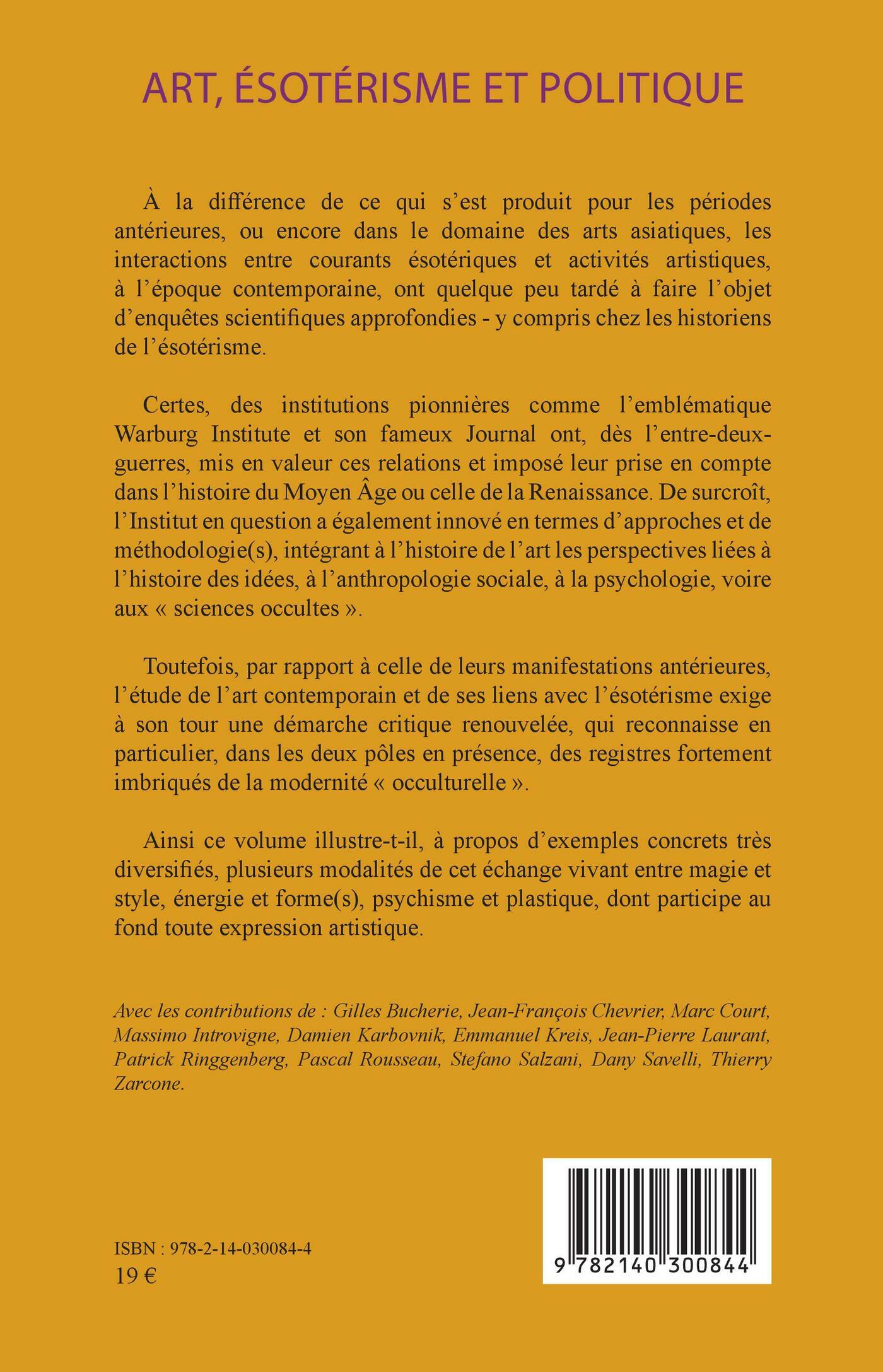 À la différence de ce qui s'est produit pour les périodes antérieures, ou encore dans le domaine des arts asiatiques, les interactions entre courants ésotériques et activités artistiques, à l'époque contemporaine, ont quelque peu tardé à faire l'objet d'enquêtes scientifiques approfondies - y compris chez les historiens de l'ésotérisme.Certes, des institutions pionnières comme l'emblématique Warburg Institute et son fameux Journal ont, dès l'entre-deux-guerres, mis en valeur ces relations et imposé leur prise en compte dans l'histoire du Moyen Âge ou celle de la Renaissance. De surcroît, l'Institut en question a également innové en termes d'approches et de méthodologie(s), intégrant à l'histoire de l'art les perspectives liées à l'histoire des idées, à l'anthropologie sociale, à la psychologie, voire aux « sciences occultes ».Toutefois, par rapport à celle de leurs manifestations antérieures, l'étude de l'art contemporain et de ses liens avec l'ésotérisme exige à son tour une démarche critique renouvelée, qui reconnaisse en particulier, dans les deux pôles en présence, des registres fortement imbriqués de la modernité « occulturelle ».Ainsi ce volume illustre-t-il, à propos d'exemples concrets très diversifiés, plusieurs modalités de cet échange vivant entre magie et style, énergie et forme(s), psychisme et plastique, dont participe au fond toute expression artistique.