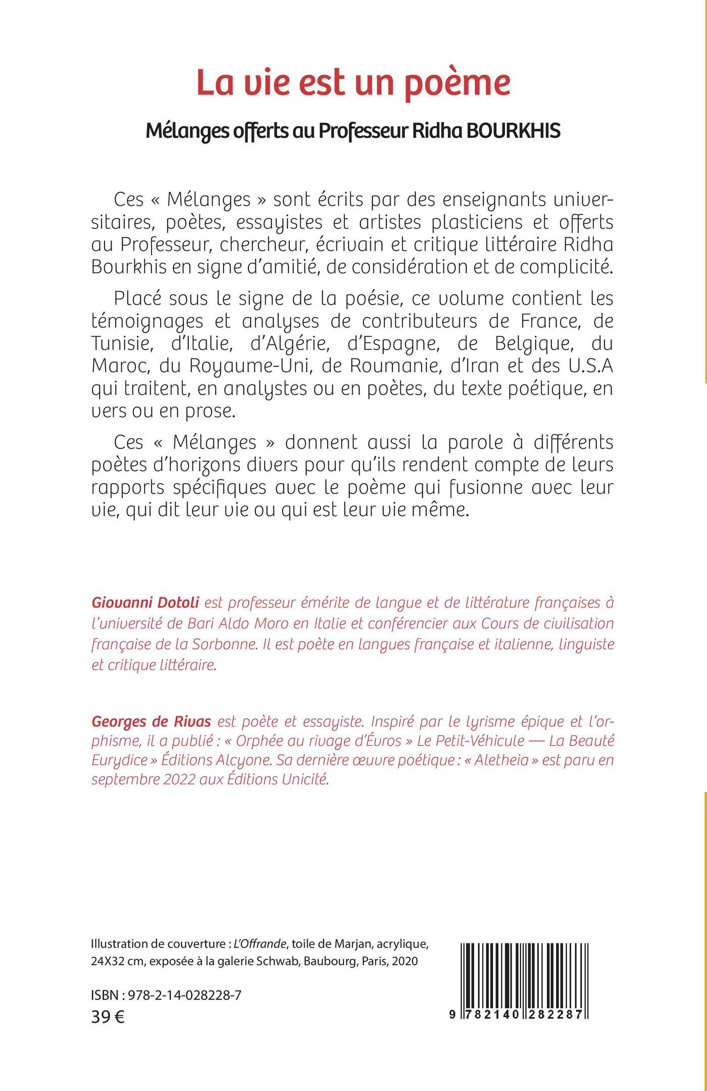 Ces « Mélanges » sont écrits par des enseignants universitaires, poètes, essayistes et artistes plasticiens et offerts au Professeur, chercheur, écrivain et critique littéraire Ridha Bourkhis en signe d'amitié, de considération et de complicité. Placé sous le signe de la poésie, ce volume contient les témoignages et analyses de contributeurs de France, de Tunisie, d'Italie, d'Algérie, d'Espagne, de Belgique, du Maroc, du Royaume-Uni, de Roumanie, d'Iran et des U.S.A qui traitent, en analystes ou en poètes, du texte poétique, en vers ou en prose. Ces « Mélanges » donnent aussi la parole à différents poètes d'horizons divers pour qu'ils rendent compte de leurs rapports spécifiques avec le poème qui fusionne avec leur vie, qui dit leur vie ou qui est leur vie même.