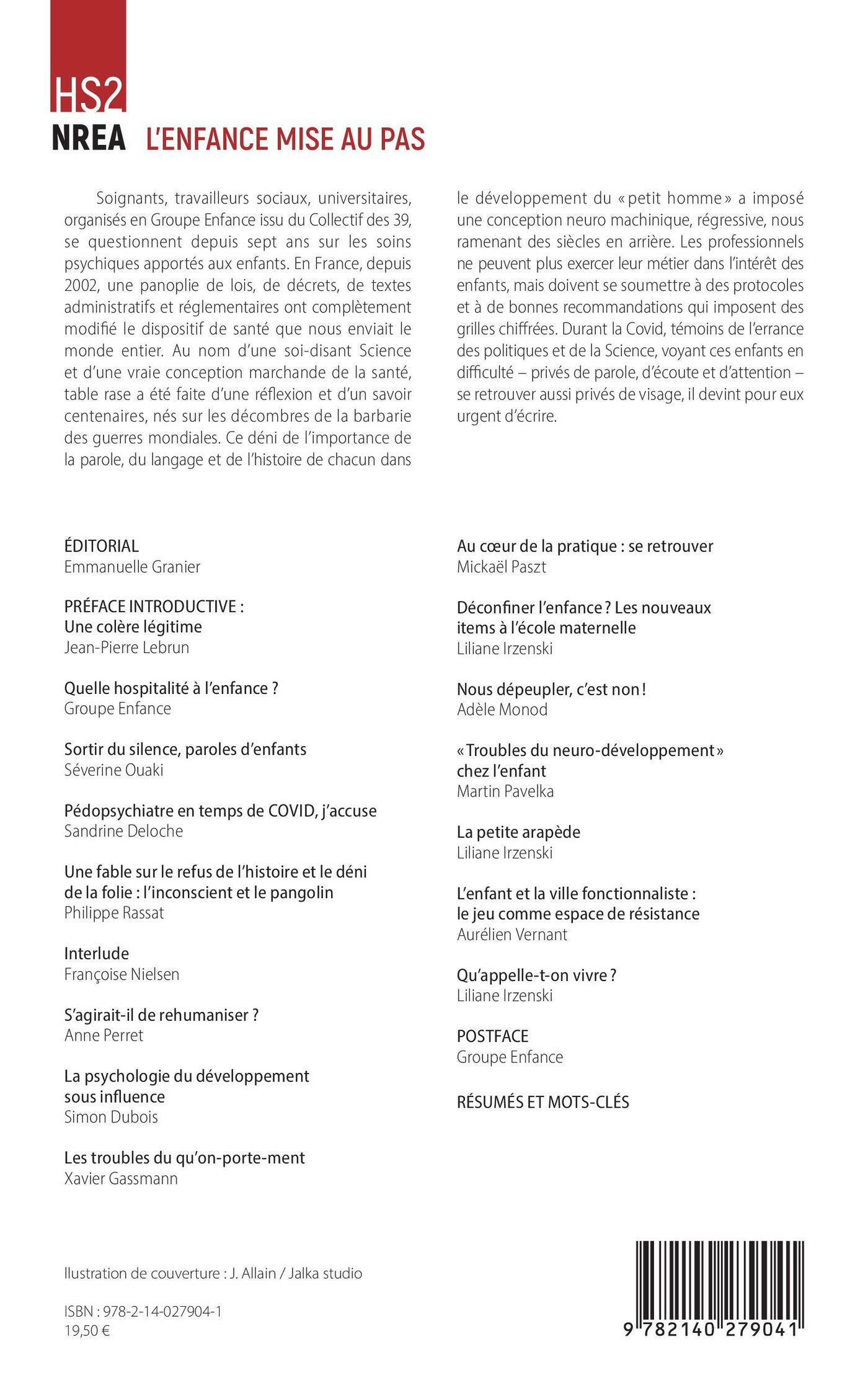 Soignants, travailleurs sociaux, universitaires, organisés en Groupe Enfance issu du Collectif des 39, se questionnent depuis sept ans sur les soins psychiques apportés aux enfants. En France, depuis 2002, une panoplie de lois, de décrets, de textes administratifs et réglementaires ont complètement modifié le dispositif de santé que nous enviait le monde entier. Au nom d'une soi-disant Science et d'une vraie conception marchande de la santé, table rase a été faite d'une réflexion et d'un savoir centenaires, nés sur les décombres de la barbarie des guerres mondiales. Ce déni de l'importance de la parole, du langage et de l'histoire de chacun dans le développement du « petit homme » a imposé une conception neuro machinique, régressive, nous ramenant des siècles en arrière. Les professionnels ne peuvent plus exercer leur métier dans l'intérêt des enfants, mais doivent se soumettre à des protocoles et à de bonnes recommandations qui imposent des grilles chiffrées. Durant la Covid, témoins de l'errance des politiques et de la Science, voyant ces enfants en difficulté – privés de parole, d'écoute et d'attention – se retrouver aussi privés de visage, il devint pour eux urgent d'écrire.ÉDITORIAL Emmanuelle Granier PRÉFACE INTRODUCTIVE : Une colère légitime Jean-Pierre LebrunQuelle hospitalité à l'enfance ? Groupe EnfanceSortir du silence, paroles d'enfants Séverine OuakiPédopsychiatre en temps de covid, j'accuse Sandrine DelocheUne fable sur le refus de l'histoire et le déni de la folie : l'inconscient et le pangolin Philippe RassatInterlude Françoise NielsenS'agirait-il de rehumaniser ? Anne PerretLa psychologie du développement sous influence Simon DuboisLes troubles du qu'on-porte-ment Xavier Gassmann Au cœur de la pratique : se retrouver Mickaël PasztDéconfiner l'enfance ? Les nouveaux items à l'école maternelle Liliane IrzenskiNous dépeupler, c'est non ! Adèle Monod« Troubles du neuro-développement » chez l'enfant Martin PavelkaLa petite arapède Liliane IrzenskiL'enfant et la ville fonctionnaliste : le jeu comme espace de résistance Aurélien VernantQu'appelle-t-on vivre ? Liliane IrzenskiPOSTFACE Groupe Enfance RÉSUMÉS ET MOTS-CLÉS