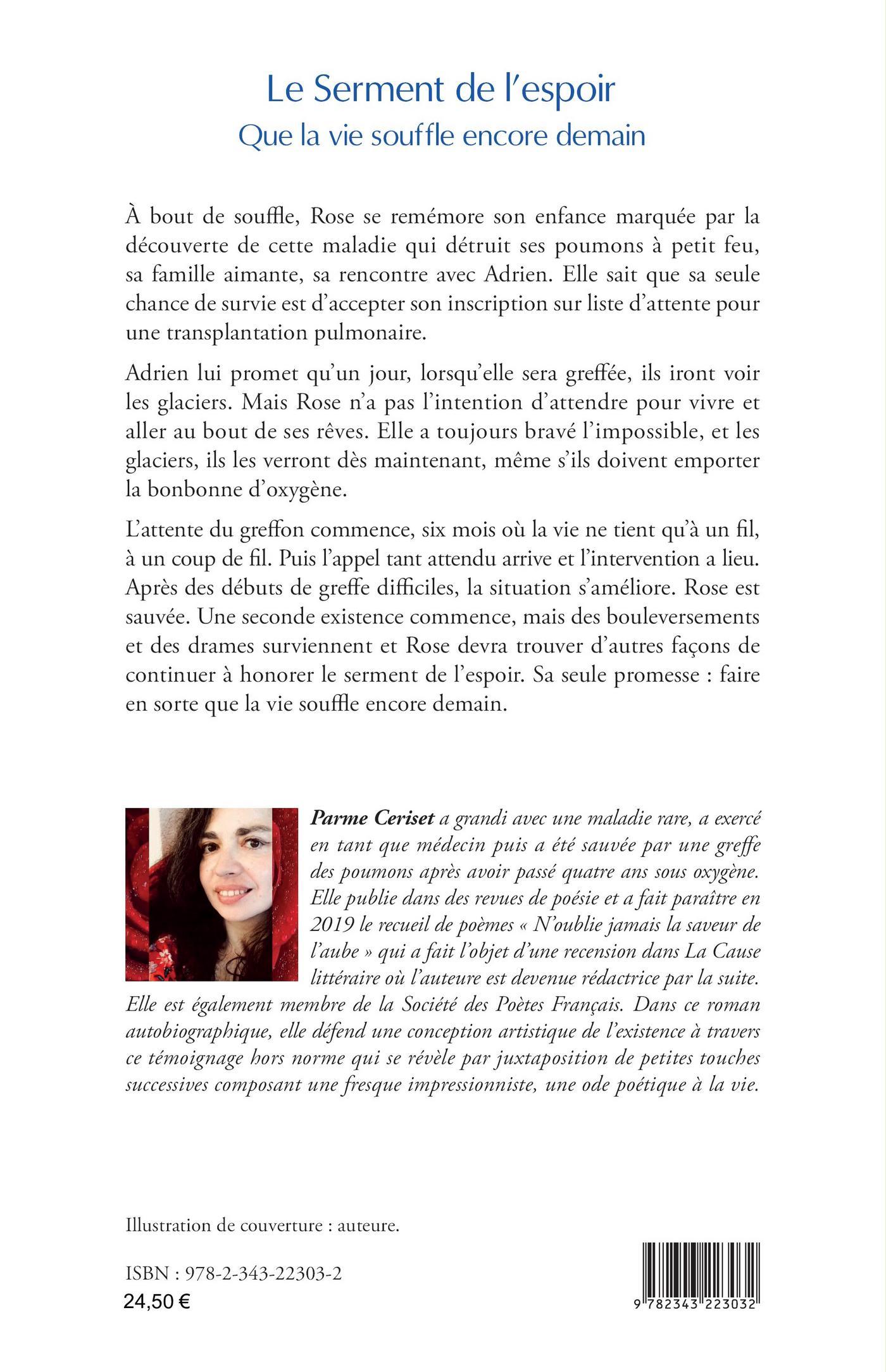 À bout de souffle, Rose se remémore son enfance marquée par la découverte de cette maladie qui détruit ses poumons à petit feu, sa famille aimante, sa rencontre avec Adrien. Elle sait que sa seule chance de survie est d’accepter son inscription sur liste d’attente pour une transplantation pulmonaire. Adrien lui promet qu’un jour, lorsqu’elle sera greffée, ils iront voir les glaciers. Mais Rose n’a pas l’intention d’attendre pour vivre et aller au bout de ses rêves. Elle a toujours bravé l’impossible, et les glaciers, ils les verront dès maintenant, même s’ils doivent emporter la bonbonne d’oxygène. L’attente du greffon commence, six mois où la vie ne tient qu’à un fil, à un coup de fil. Puis l’appel tant attendu arrive et l’intervention a lieu. Rose est sauvée. Une seconde existence commence, mais des bouleversements et des drames surviennent et Rose devra trouver d’autres façons de continuer à honorer le serment de l’espoir. Sa seule promesse : faire en sorte que la vie souffle encore demain.