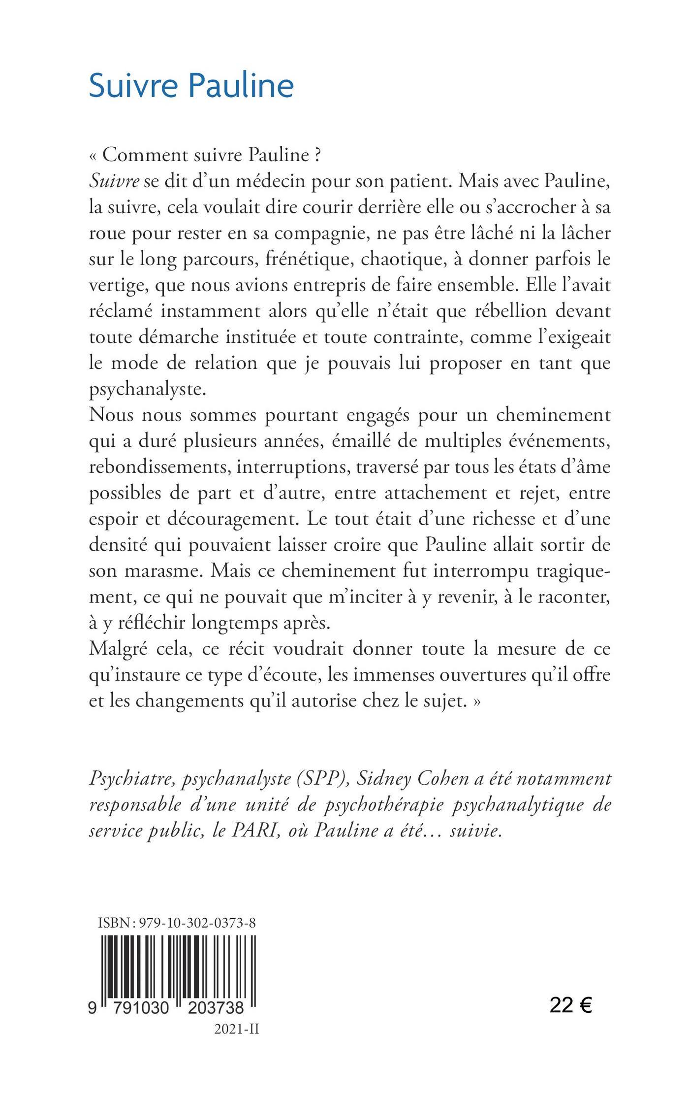""Comment suivre Pauline ? Suivre se dit d'un médecin pour son patient. Mais avec Pauline, la suivre, cela voulait dire courir derrière elle ou s'accrocher à sa roue pour rester en sa compagnie, ne pas être lâché ni la lâcher sur le long parcours, frénétique, chaotique, à donner parfois le vertige, que nous avions entrepris de faire ensemble. Elle l'avait réclamé instamment alors qu'elle n'était que rébellion devant toute démarche instituée et toute contrainte, comme l'exigeait le mode de relation que je pouvais lui proposer en tant que psychanalyste. Nous nous sommes pourtant engagés pour un cheminement qui a duré plusieurs années, émaillé de multiples événements, rebondissements, interruptions, traversé par tous les états d'âme possibles de part et d'autre, entre attachement et rejet, entre espoir et découragement. Le tout était d'une richesse et d'une densité qui pouvaient laisser croire que Pauline allait sortir de son marasme. Mais ce cheminement fut interrompu tragiquement, ce qui ne pouvait que m'inciter à y revenir, à le raconter, à y réfléchir longtemps après. Malgré cela, ce récit voudrait donner toute la mesure de ce qu'instaure ce type d'écoute, les immenses ouvertures qu'il offre et les changements qu'il autorise chez le sujet.""