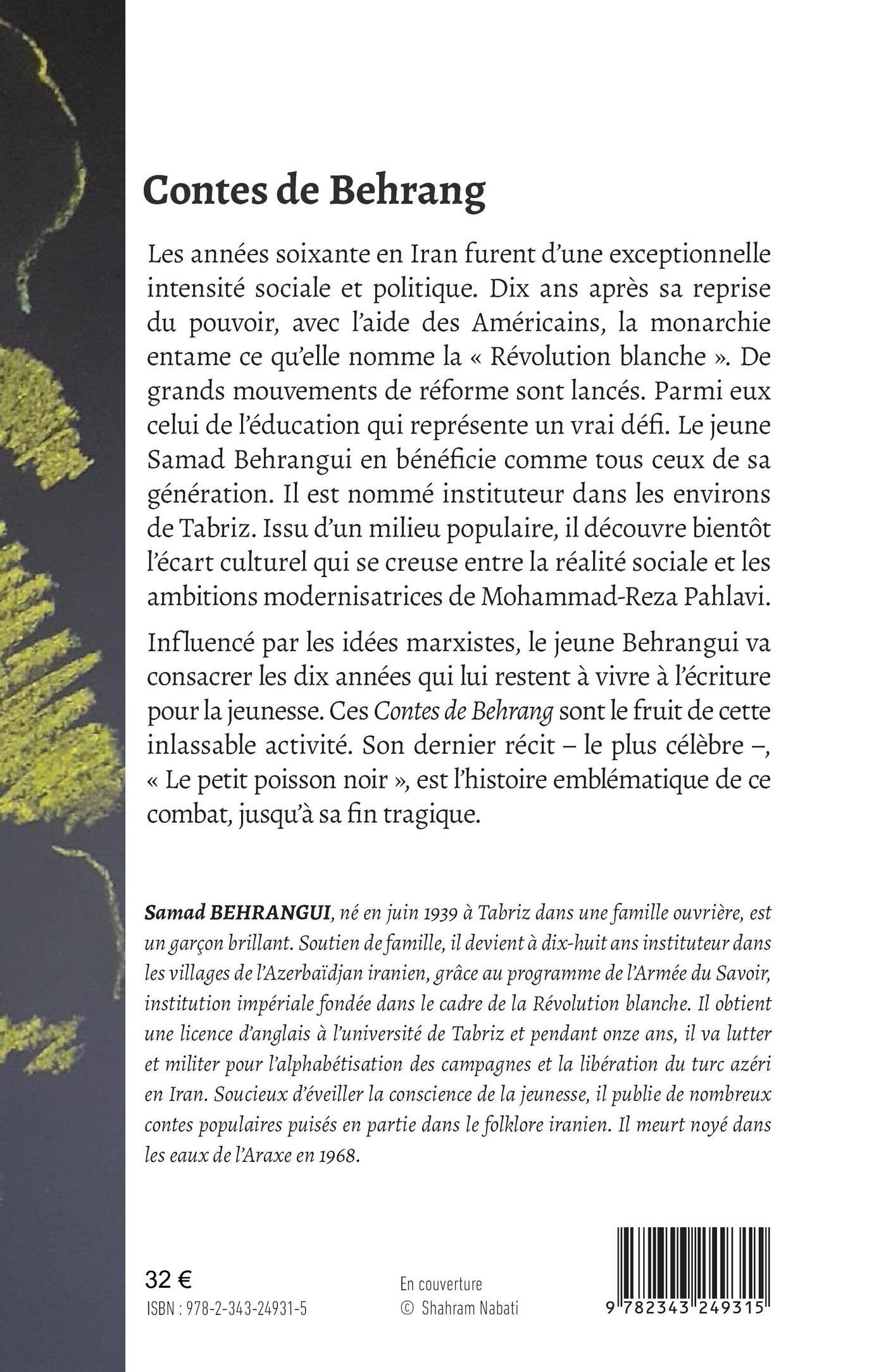 Les années soixante en Iran furent d’une exceptionnelle intensité sociale et politique. Dix ans après sa reprise du pouvoir, avec l’aide des Américains, la monarchie entame ce qu’elle nomme la « Révolution blanche ». De grands mouvements de réforme sont lancés. Parmi eux celui de l’éducation. Le jeune Samad Behrangui en bénéficie comme tous ceux de sa génération. Il est nommé instituteur dans les environs de Tabriz. Issu d’un milieu populaire, il découvre bientôt l’écart culturel qui se creuse entre la réalité sociale et les ambitions modernisatrices de Mohammad-Reza Pahlavi. Influencé par les idées marxistes, le jeune Behrangui va consacrer les dix années qui lui restent à vivre à l’écriture pour la jeunesse. Ces Contes de Behrang sont le fruit de cette inlassable activité.