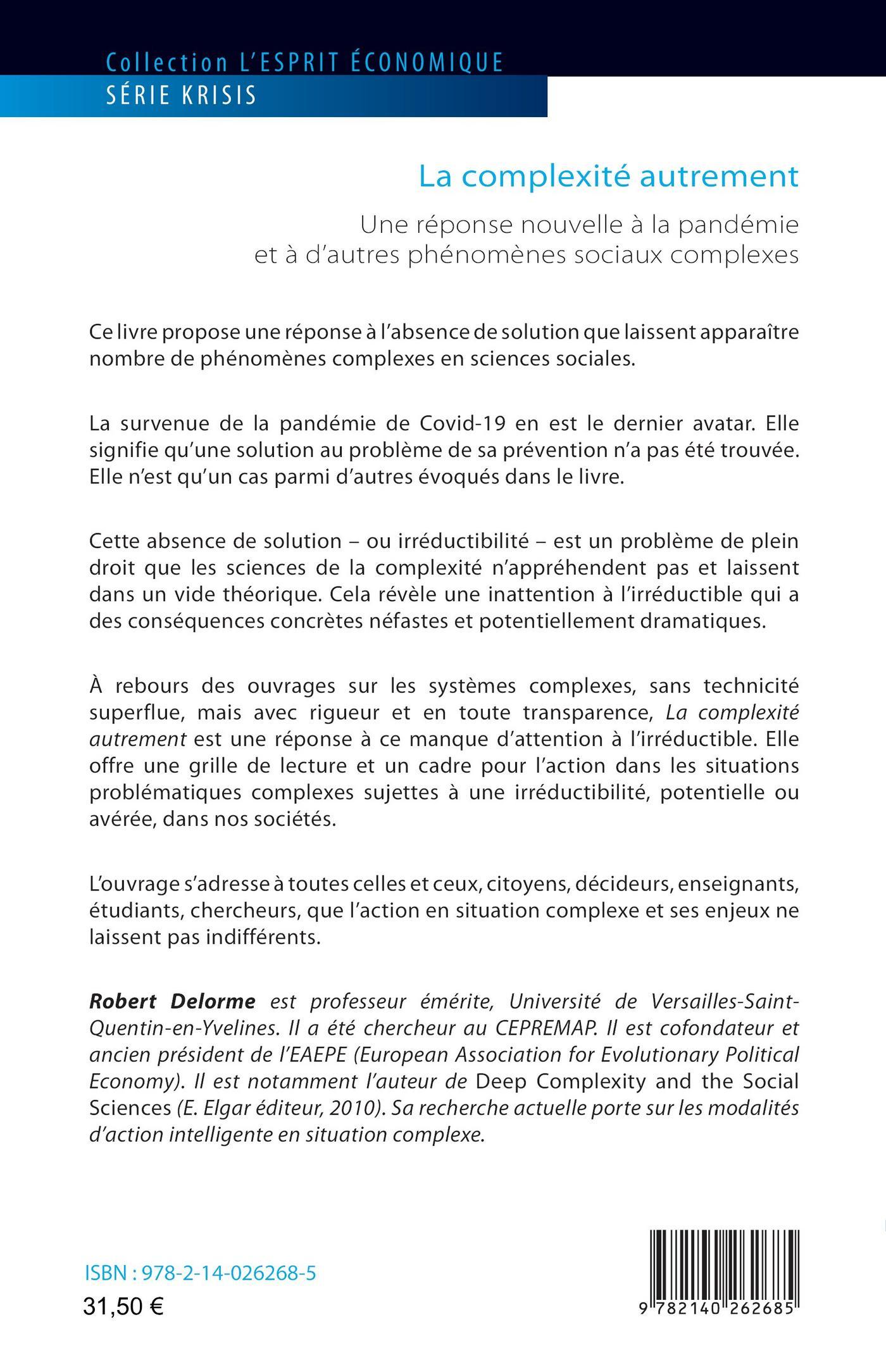 Ce livre propose une réponse à l’absence de solution que laissent apparaître nombre de phénomènes complexes en sciences sociales. La survenue de la pandémie de Covid-19 en est le dernier avatar. Elle signifie qu’une solution au problème de sa prévention n’a pas été trouvée. Elle n’est qu’un cas parmi d’autres évoqués dans le livre. Cette absence de solution est un problème de plein droit que les sciences de la complexité n’appréhendent pas et laissent dans un vide théorique. À rebours des ouvrages sur les systèmes complexes, sans technicité superflue, mais avec rigueur et en toute transparence, La complexité autrement est une réponse à ce manque d’attention à l’irréductible. Elle offre une grille de lecture et un cadre pour l’action dans les situations problématiques complexes sujettes à une irréductibilité, potentielle ou avérée, dans nos sociétés. L’ouvrage s’adresse à toutes celles et ceux, citoyens, décideurs, enseignants, étudiants, chercheurs, que l’action en situation complexe et ses enjeux ne laissent pas indifférents.